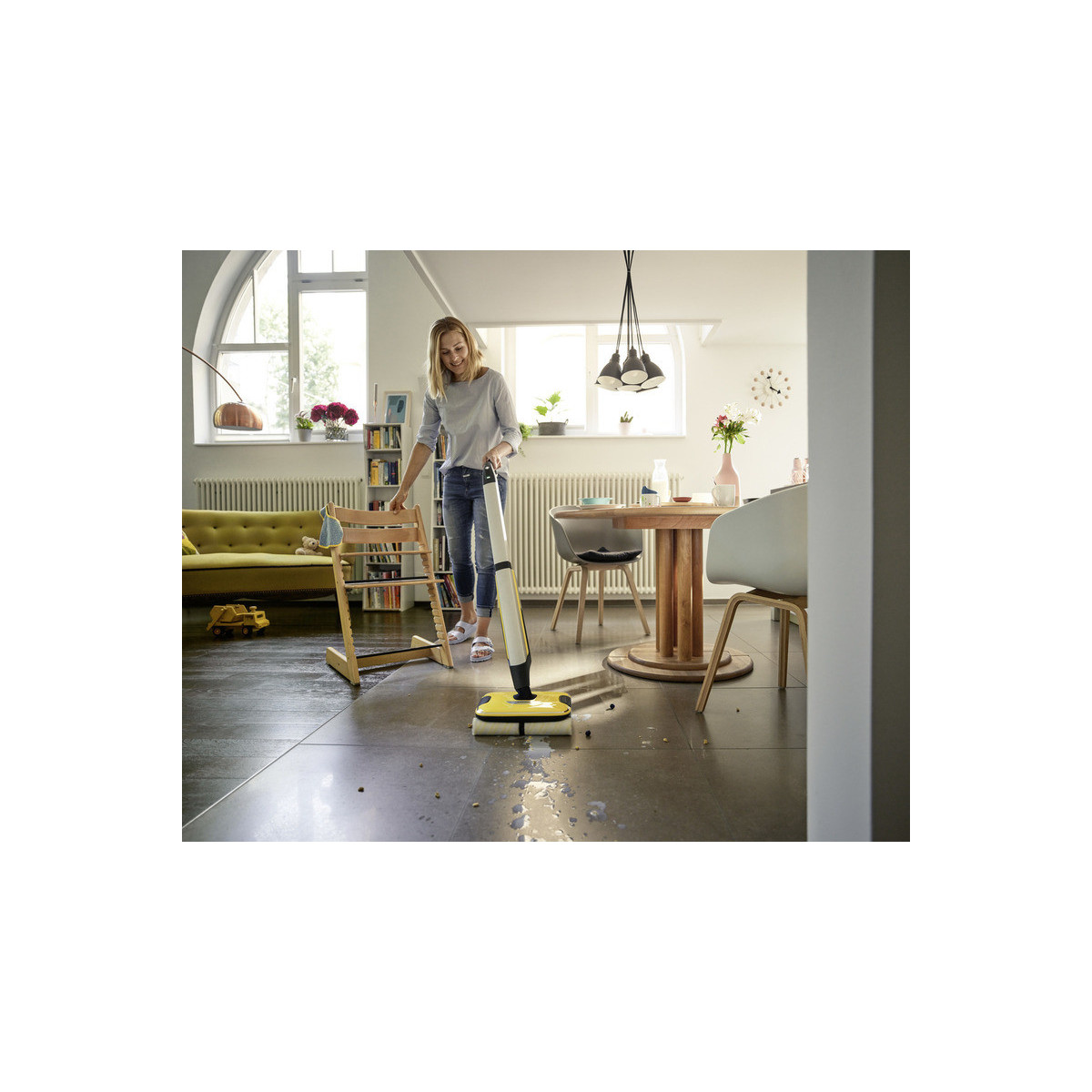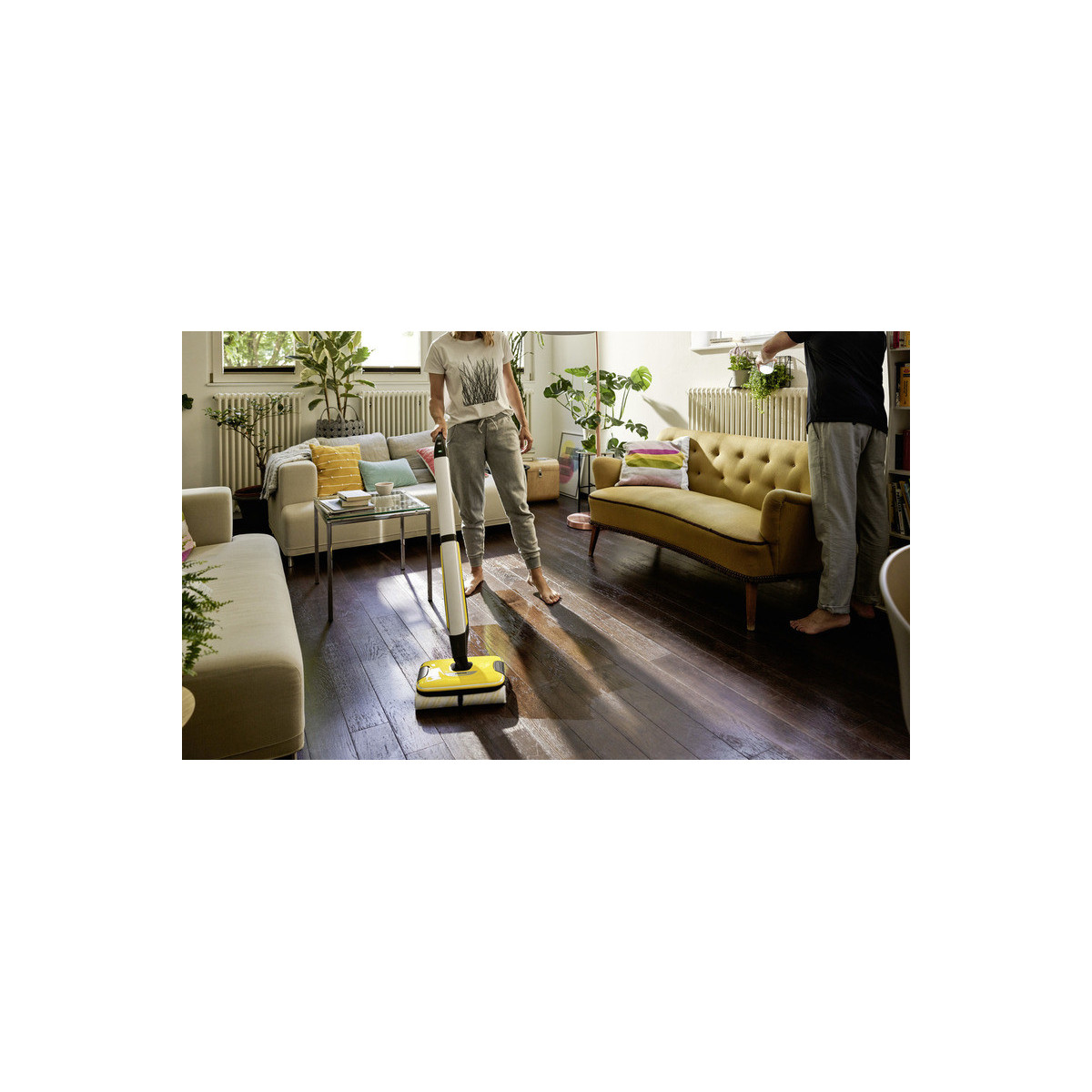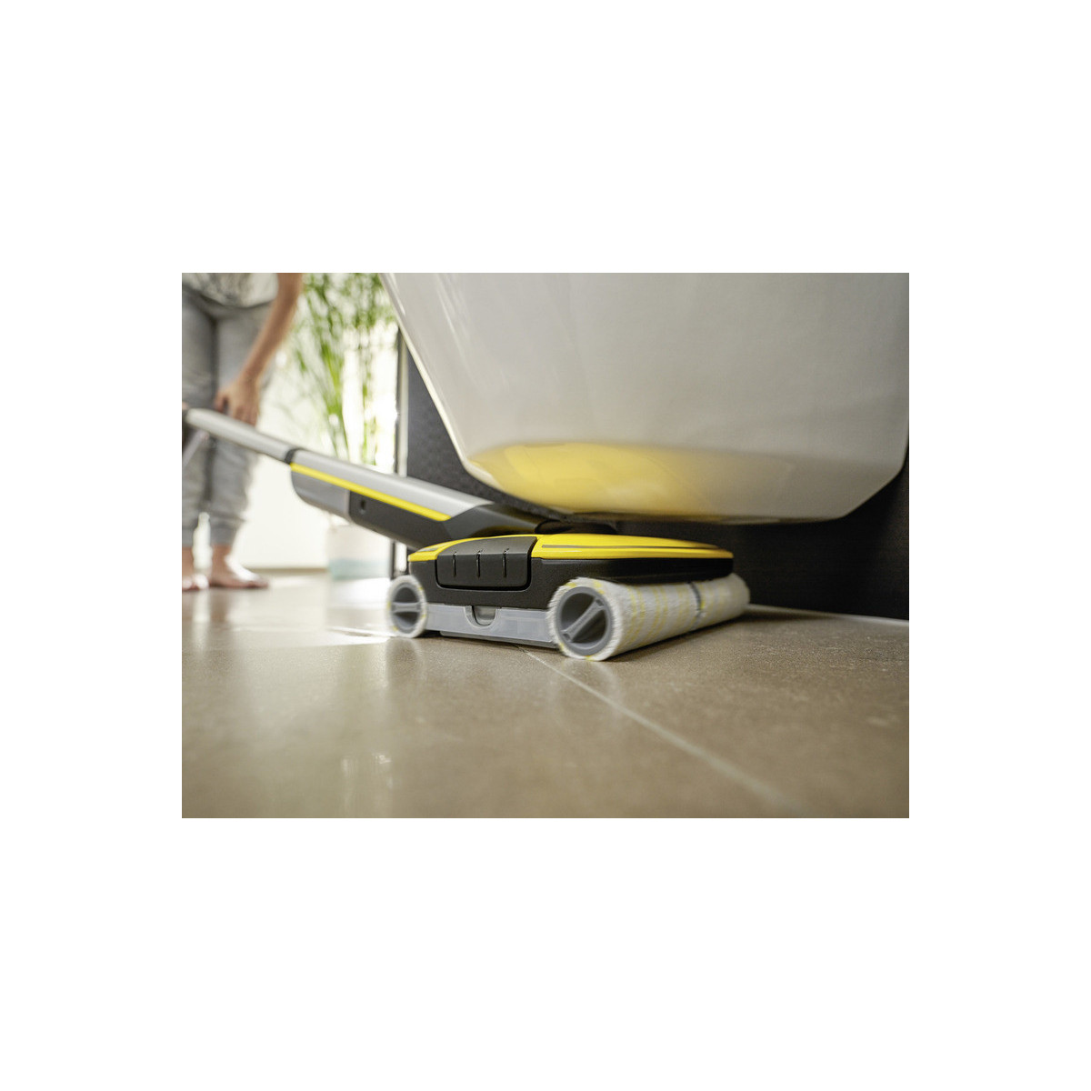La lavapavimenti a batteria FC 7 raccoglie lo sporco quotidiano sia asciutto che umido in una sola passata. Non è più necessario passare l'aspirapolvere prima di pulire e si può così risparmiare fino alla metà del tempo **. La sua tecnologia a quattro rulli con rotazione controrotante consente una pulizia rapida ed efficace. Anche peli e capelli vengono raccolti senza problemi grazie al pratico filtro. Inoltre, la lavapavimenti permette la pulizia dei pavimenti fino ai battiscopa, pulendo fino al 20% in più rispetto al tradizionale spazzolone*. Trascinare faticosamente il secchio è un ricordo del passato, poiché la FC 7 ha due serbatoi: uno per l'acqua pulita e uno per quella sporca. I rulli vengono costantemente bagnati con acqua pulita mentre l'acqua sporca finisce direttamente nel serbatoio dedicato. Il volume dell'acqua e la velocità di rotazione dei rulli possono essere regolati su due livelli di pulizia per adattarsi al tipo di pavimento. La funzione boost invece agisce contro lo sporco ostinato. L'autonomia della batteria è di 45 minuti, per un'area di pulizia di circa 135 m². Il dispositivo è adatto a tutti i pavimenti duri (piastrelle, parquet, laminato, PVC, vinile).