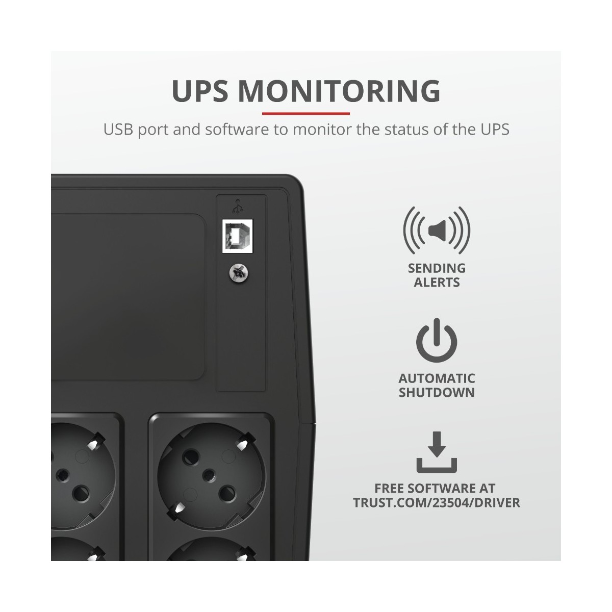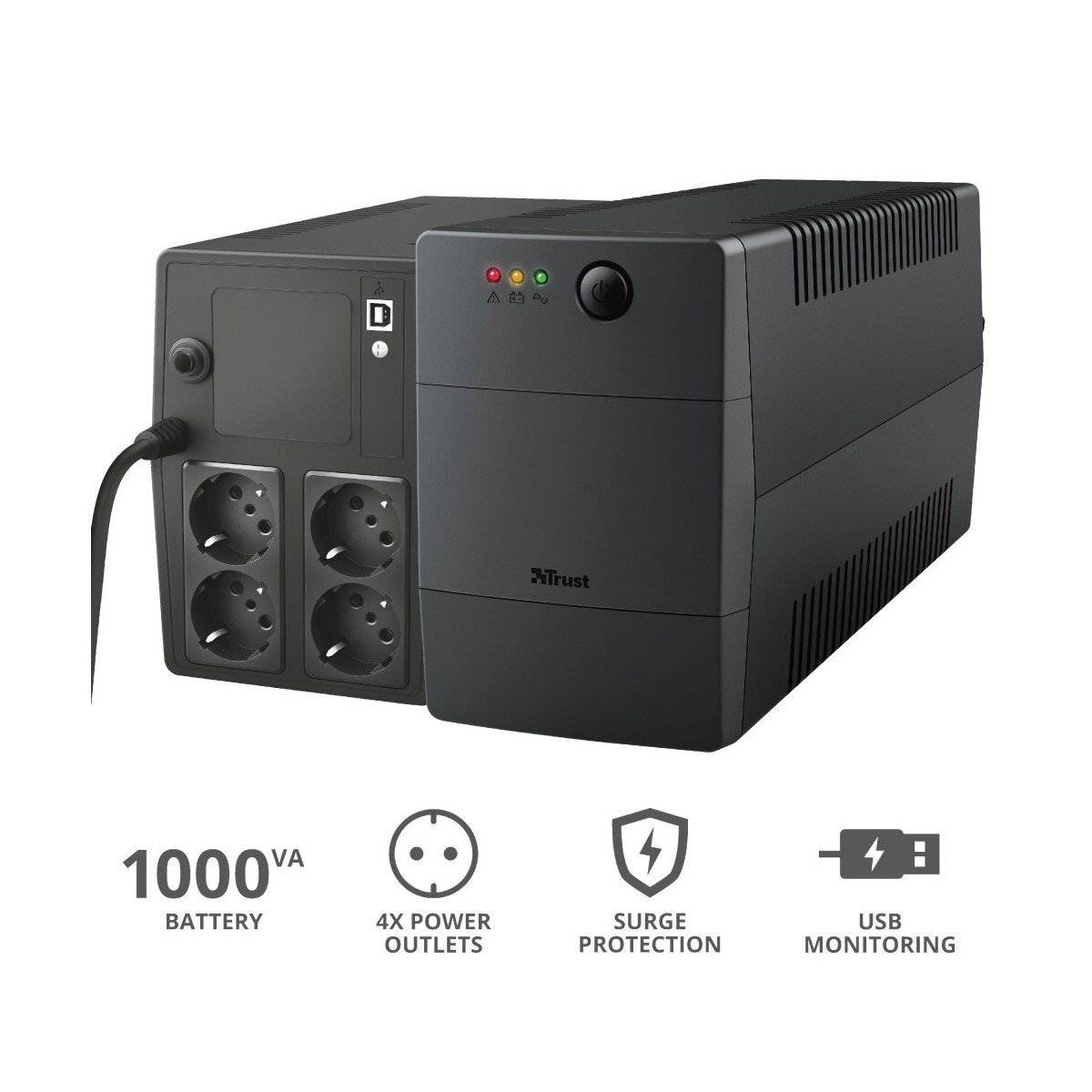 Mentre Trust Paxxon 1000VA tiene d'occhio i tuoi dispositivi, tu puoi stare tranquillo. Questo affidabile gruppo di continuità (UPS) è una fonte di alimentazione secondaria per gli apparecchi elettronici e li alimenta temporaneamente durante i blackout, proteggendoli dai danni causati dagli sbalzi di tensione.