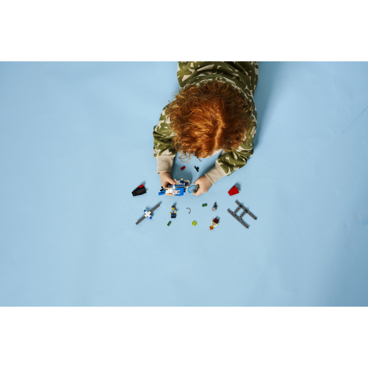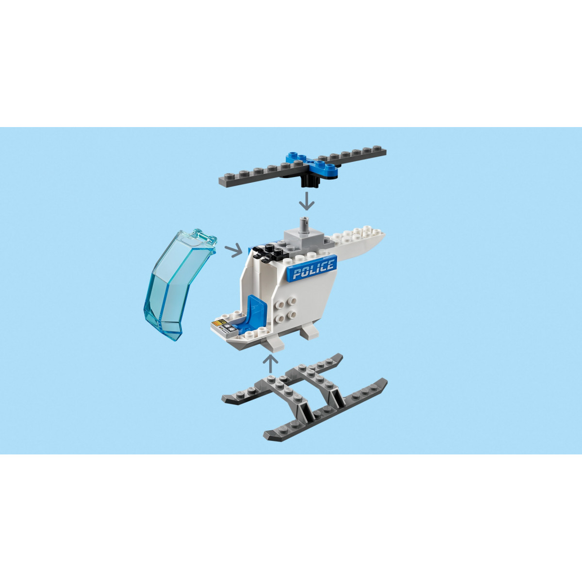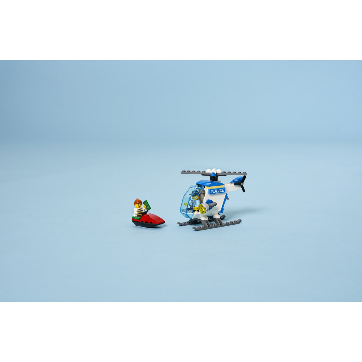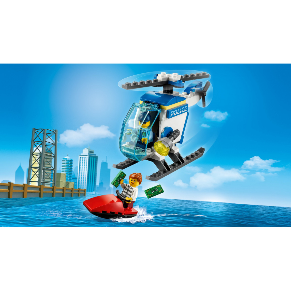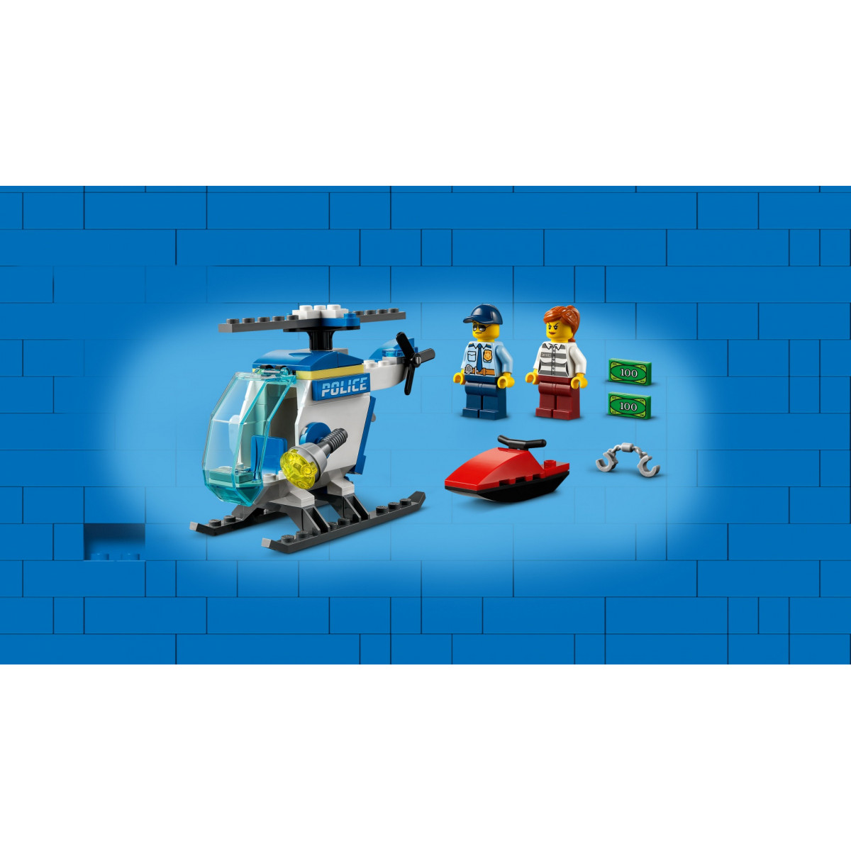 - Cosa c'è nella scatola? Un robusto elicottero della polizia, il jet ski della ladra e 2 elementi banconota, oltre alle minifigure del poliziotto e del ladro. Basta aggiungere un tocco di fantasia per un divertimento senza fine!