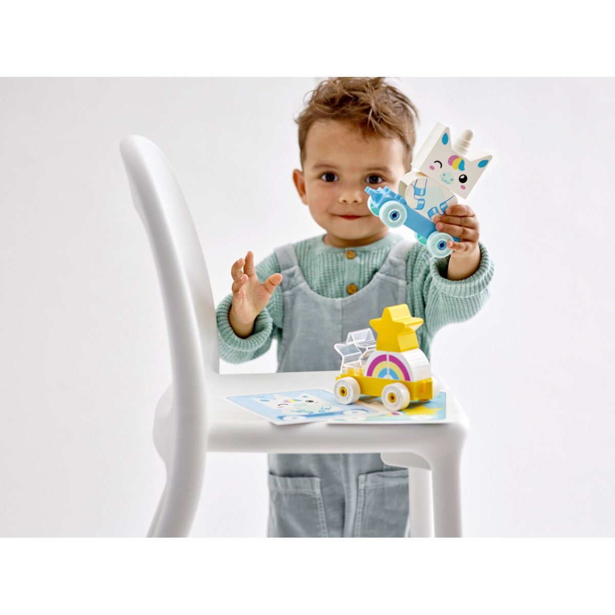 Questo adorabile unicorno trainabile coinvolge i bambini in giochi ricchi di fantasia, consentendo loro di sviluppare capacità di costruzione di base e imparare a riconoscere forme e colori. Le possibilità di apprendimento tramite il gioco sono infinite, grazie a forme super-ergonomiche che anche le manine più piccole riescono ad afferrare, collegare e rimuovere dai vagoncini con facilità. Per aumentare il divertimento, i bambini possono collegare il treno ad altri giocattoli LEGO® DUPLO® dotati di ruote.