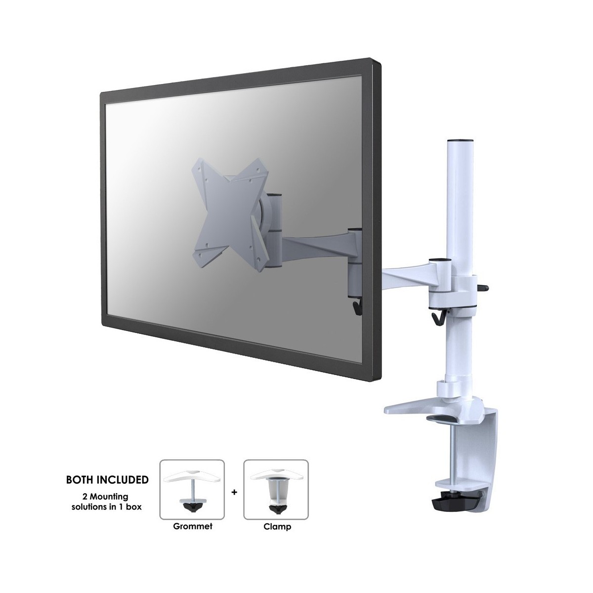 Questo braccio porta monitor NewStar, modello FPMA-D1330WHITE consente di collegare un schermo LCD/LED/TFT su di una scrivania con la modalità di fissaggio su piano attraverso vite centrale o morsetto.