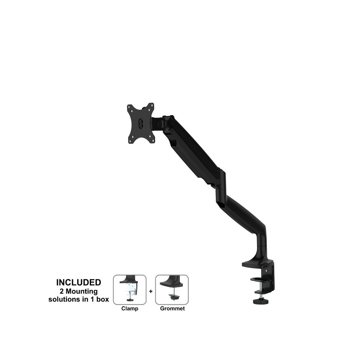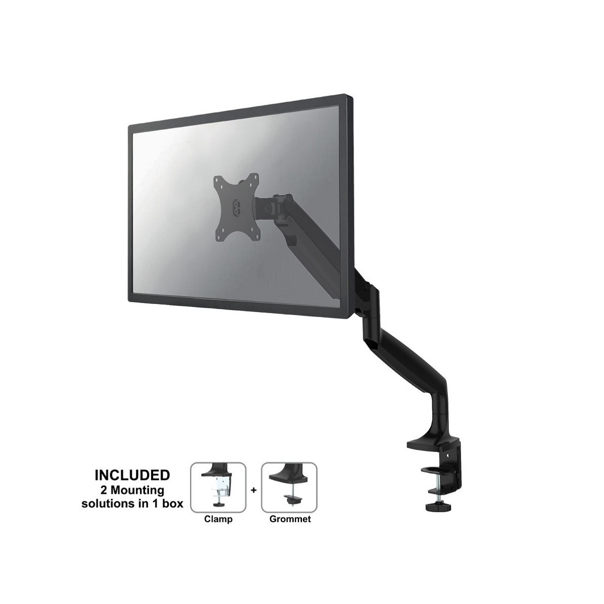 Questo braccio porta monitor NewStar, modello NM-D750BLACK consente di collegare uno schermo LCD/LED/TFT su di una scrivania con la modalità di fissaggio su piano attraverso un morsetto o vite centrale (entrambe sono incluse).