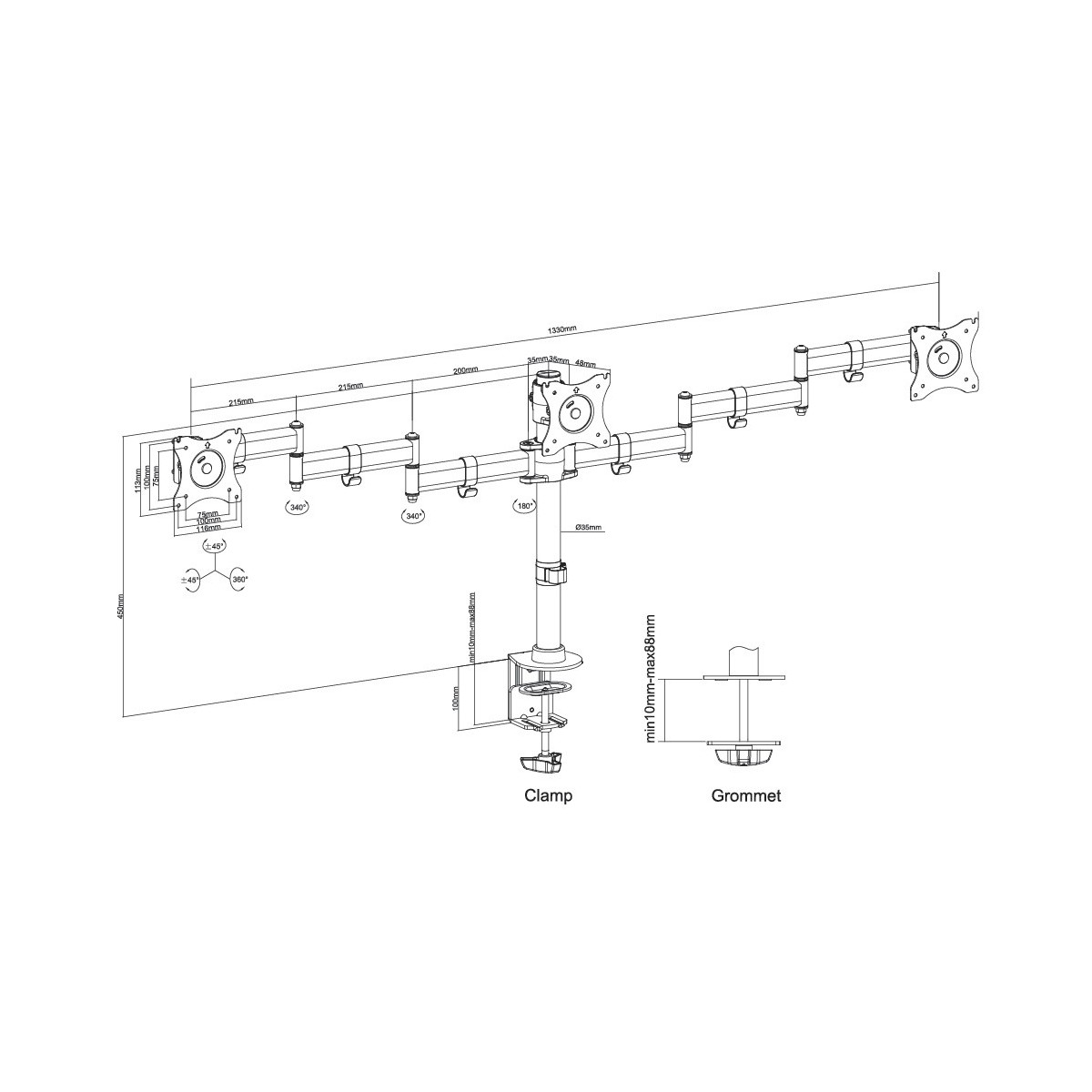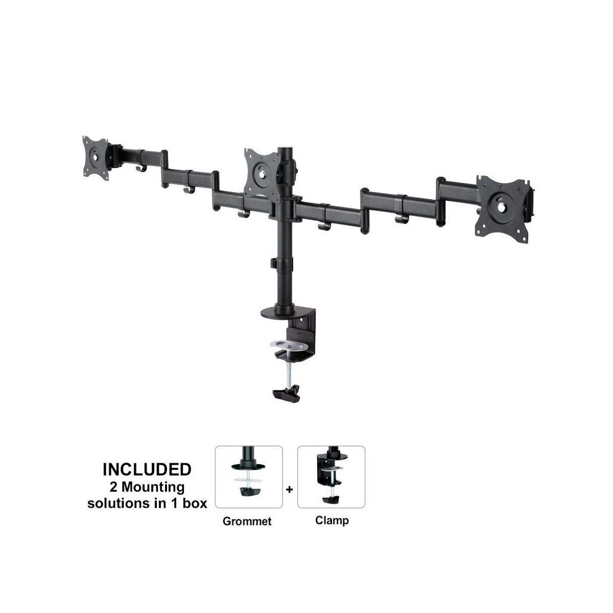 Il supporto NM-D135D3BLACK ha 4 punti di articolazione ed è adatto a schermi fino a 27" (69 cm) con una capacità massima di trasporto di 24 kg (8 kg per ogni schermo). Questo prodotto è adatto per schermi con fori VESA modello 75x75 o 100x100 mm. Per una diversa (più grande) foratura, si può combinare con una delle nostre piastre di adattamento VESA.