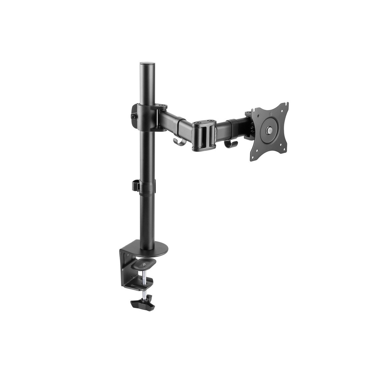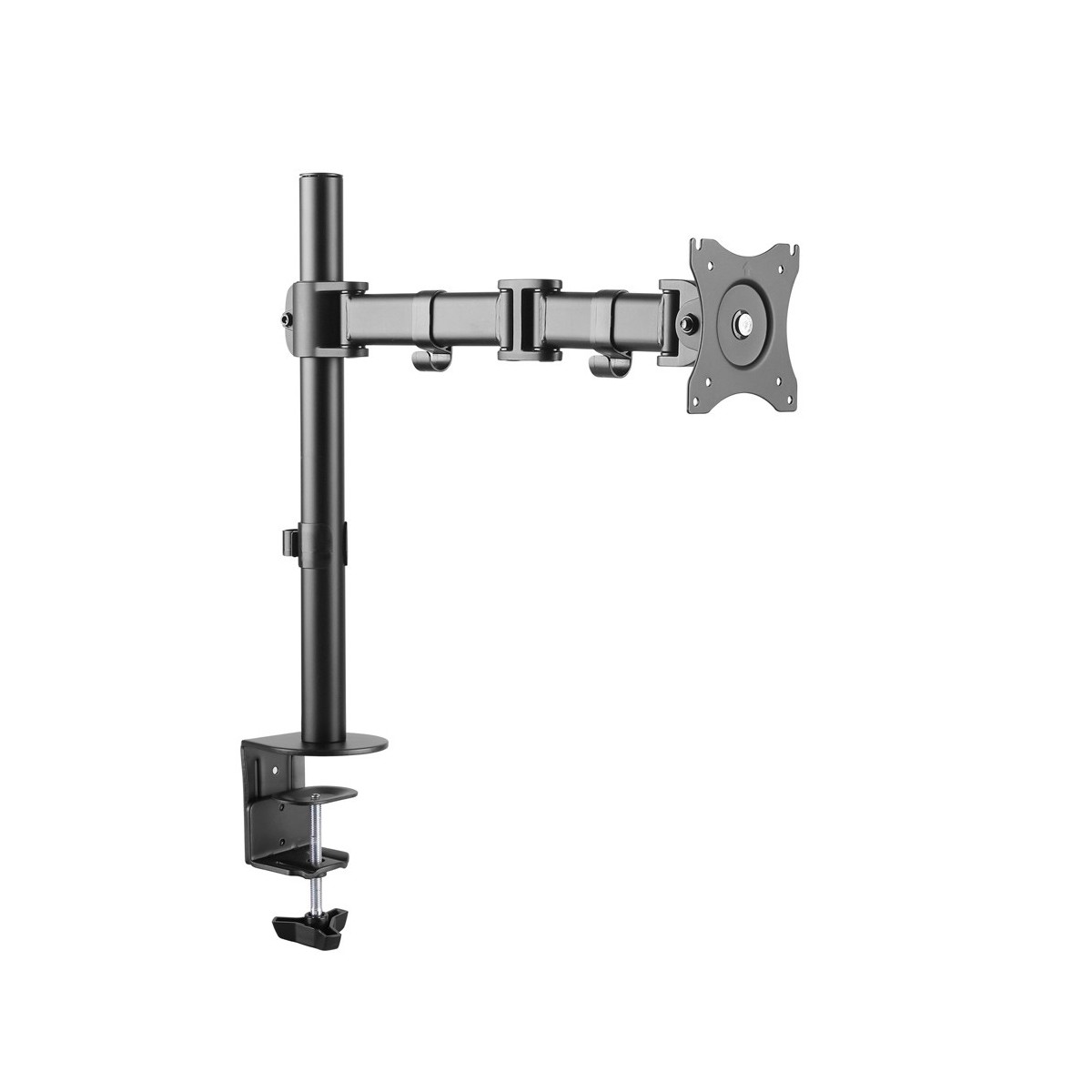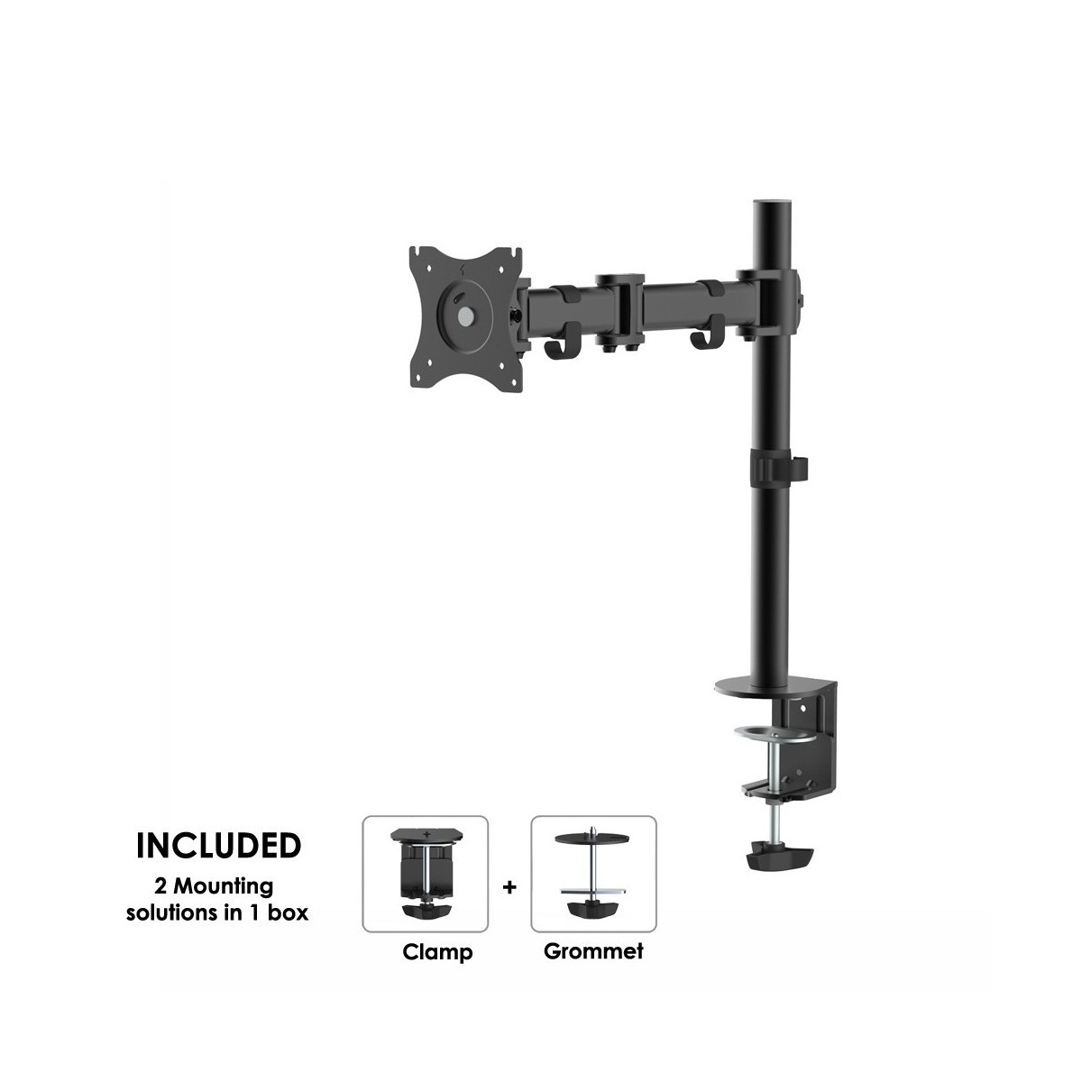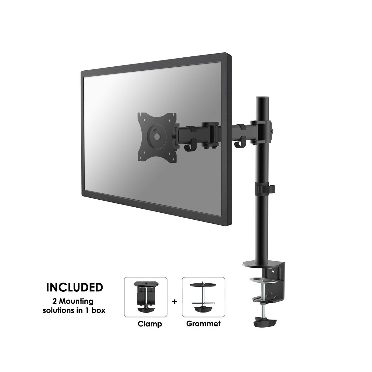 Questo braccio porta monitor NewStar, modello NM-D135BLACK consente di collegare un schermo LCD/LED/TFT su di una scrivania con la modalità di fissaggio su piano attraverso vite centrale o morsetto.