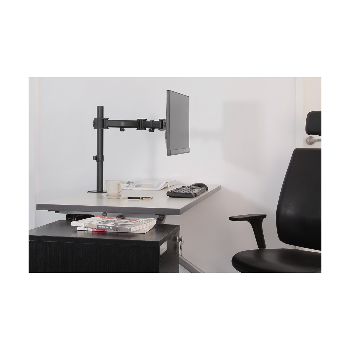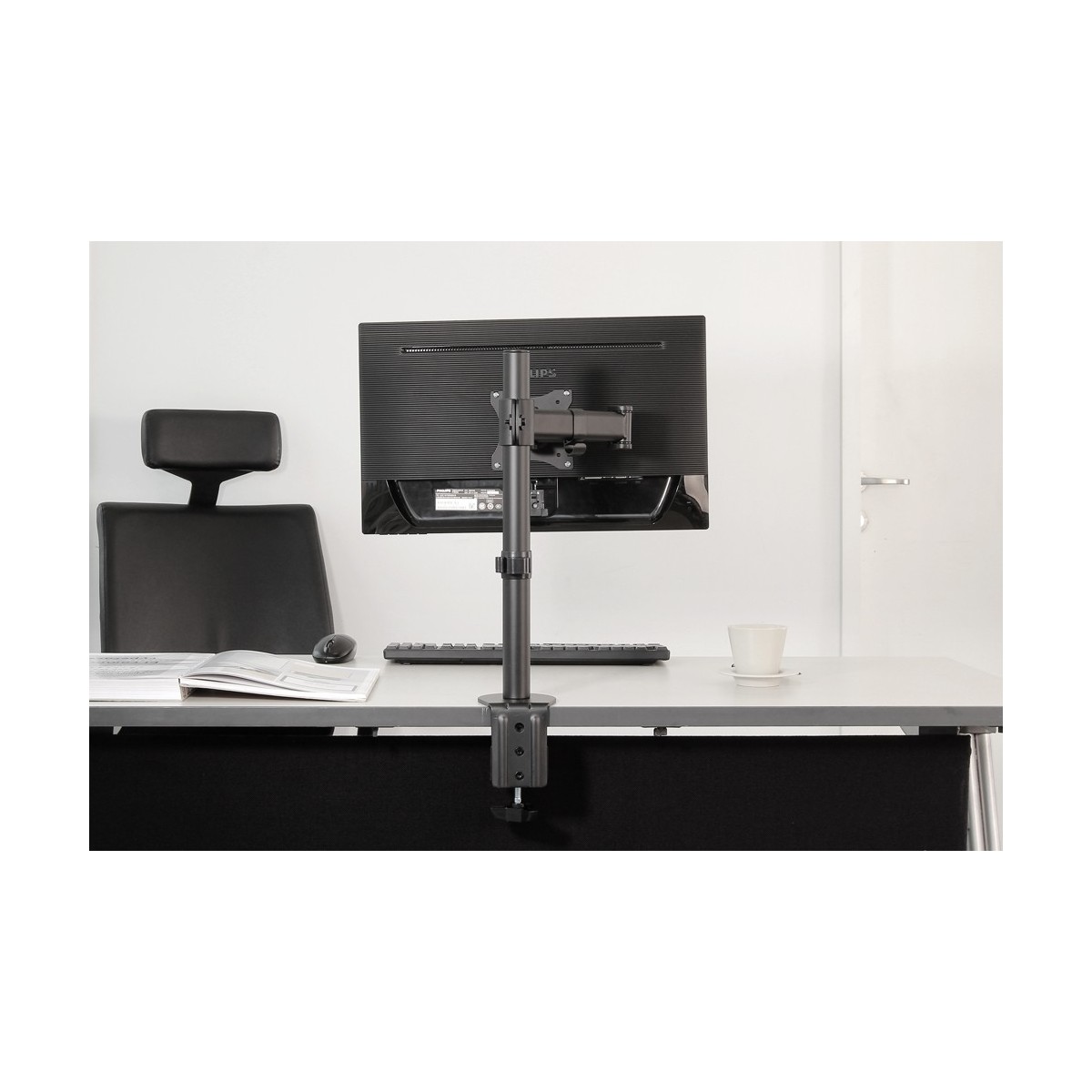 Utilizzate un braccio porta monitor per sfruttare pienamente le capacità del vostro schermo. Il braccio è facile da regolare in altezza e profondità. È inoltre possibile inclinare lo schermo in senso verticale, orizzontale e farlo ruotare; questo crea la posizione ergonomica di lavoro ideale riducendo il rischio di mal di schiena e al collo. I cavi possono essere collocati sul lato inferiore del braccio.