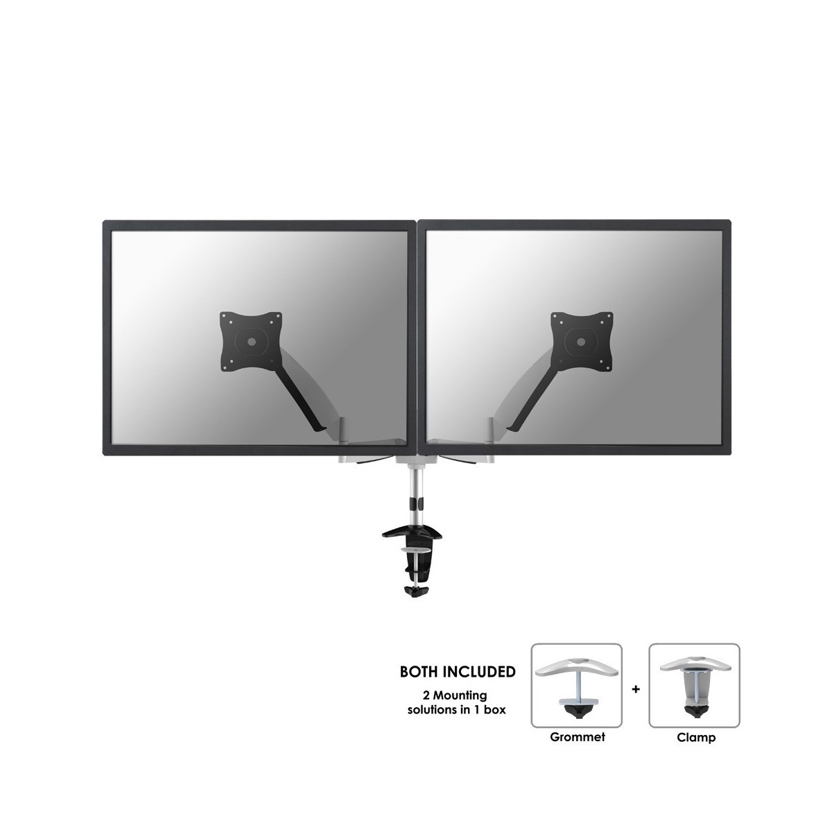 Questo braccio porta monitor NewStar, modello FPMA-D950D consente di collegare due schermi LCD/LED/TFT su di una scrivania con la modalità di fissaggio su piano attraverso un morsetto o vite centrale (entrambe sono incluse).