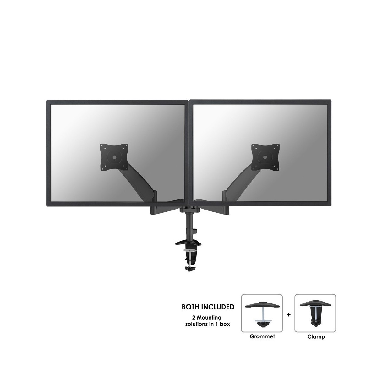 Questo braccio porta monitor NewStar, modello FPMA-D950DBLACK consente di collegare due schermi LCD/LED/TFT su di una scrivania con la modalità di fissaggio su piano attraverso un morsetto o vite centrale (entrambe sono incluse).