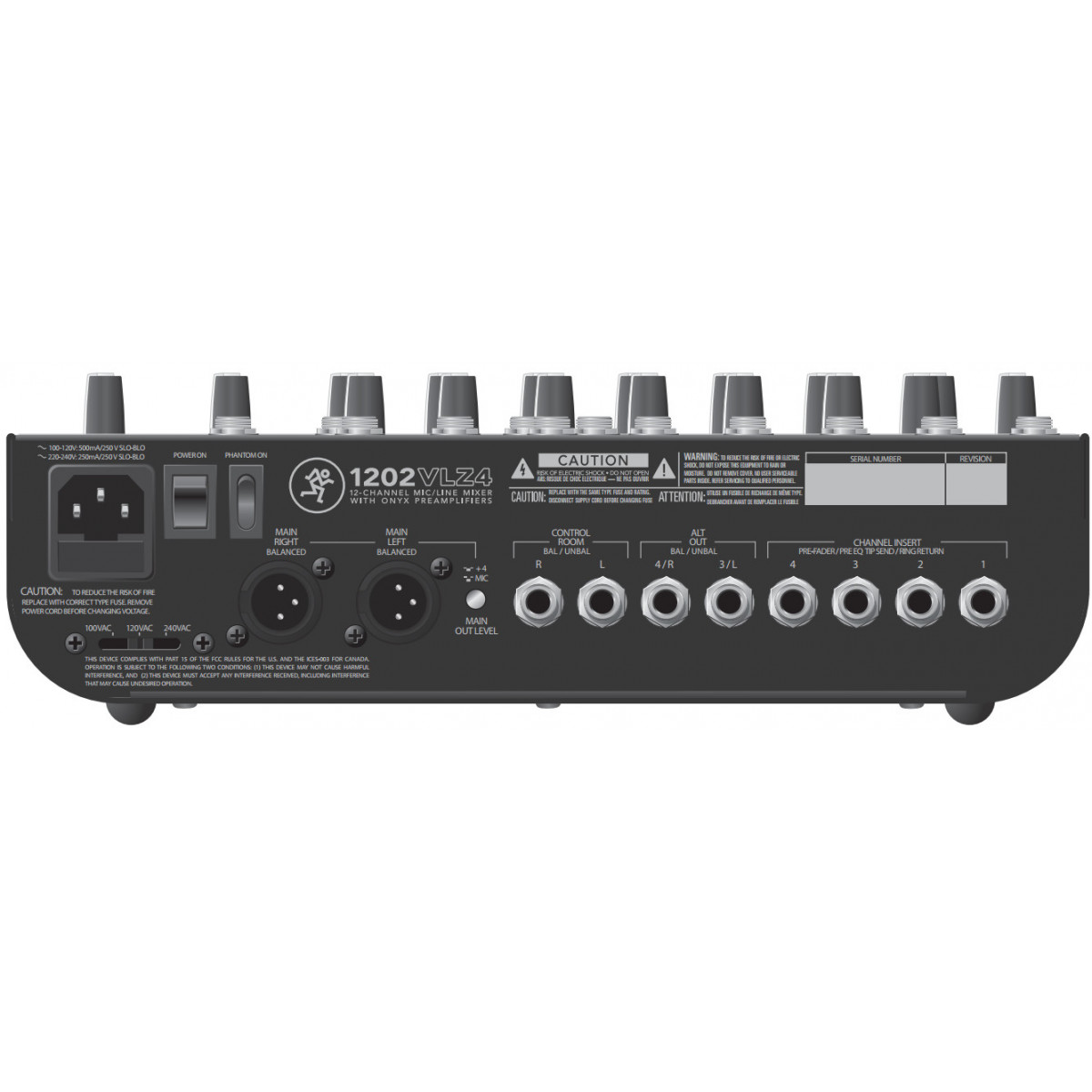 Mackie 1202VLZ4. Quantità di canali: 12 canali, Range di frequenza: 20 - 20000 Hz, Line Signal-to-Noise Ratio (SNR): 90 dB. Impedenza ingresso: 10000 Ω, Impedenza ingresso microfono: 2500 Ω. Consumi: 25 W. Larghezza: 303 mm, Profondità: 272 mm, Altezza: 75 mm