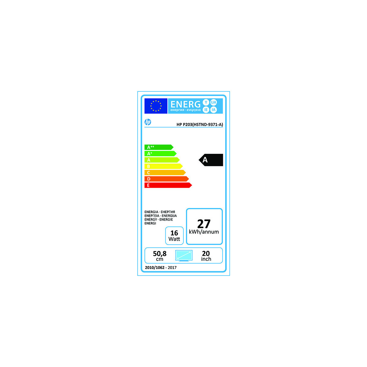 HP ProDisplay P203. Dimensioni schermo: 50,8 cm (20"), Risoluzione del display: 1600 x 900 Pixel, Tipologia HD: HD+, Tecnologia display: LED. Tipologia display: LED. Tempo di risposta: 5 ms, Rapporto d'aspetto nativo: 16:9, Angolo di visualizzazione (orizzontale): 170°, Angolo di visualizzazione (verticale): 160°. Montaggio standard VESA. Certificazione Energy Star, Colore del prodotto: Nero