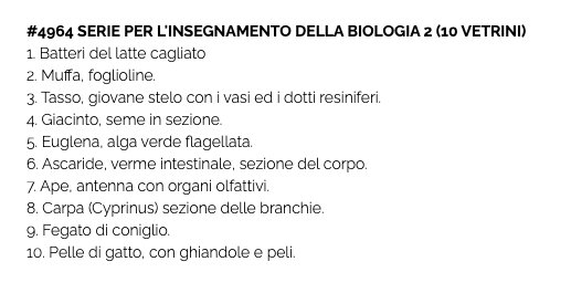 | Questo set contiene i seguenti vetrini preparati | 1. Batteri del latte cagliato 2. Muffa, foglioline. 3. Tasso, giovane stelo con i vasi ed i dotti resiniferi. 4. Giacinto, seme in sezione. 5. Euglena, alga verde flagellata. 6. Ascaride, verme intestinale, sezione del corpo. 7. Ape, antenna con organi olfattivi. 8. Carpa (Cyprinus) sezione delle branchie. 9. Fegato di coniglio. 10. Pelle di gatto, con ghiandole e peli. |