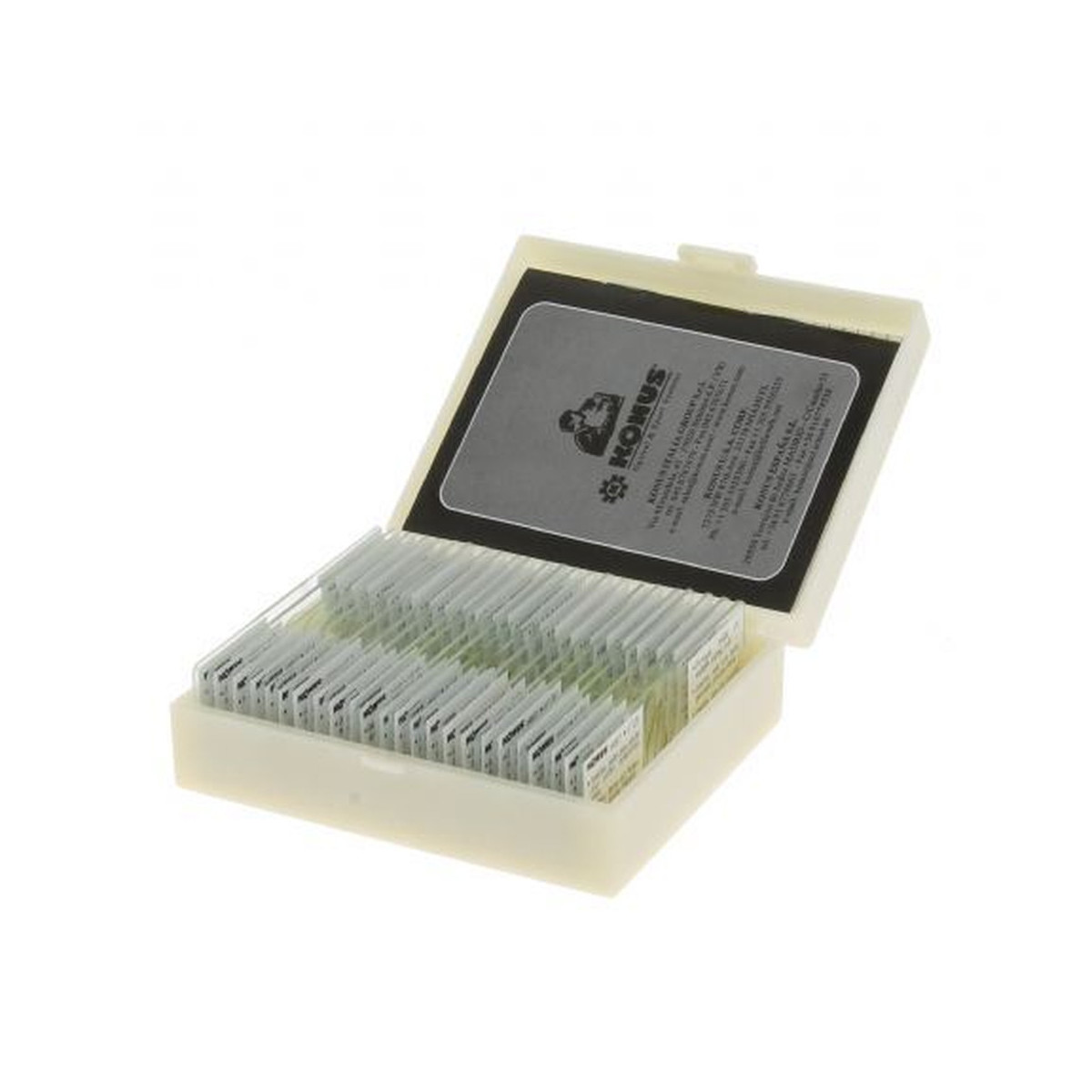 | Questo set contiene le seguenti diapositive preparate | 1. Coscia di mosca domestica, Musca domestica. 2. Piuma di uccello 3. Scaglie di ali di farfalla 4. Striscio di sangue umano 5. Intestino di coniglio 6. Sezione trasversale polmone di gatto 7. Plancton misto zoologico e botanico 8. Granuli di polline di piante diverse 9. Foglia foliata con venature retinate 10. Grandi cellule, midollo di edelberry |