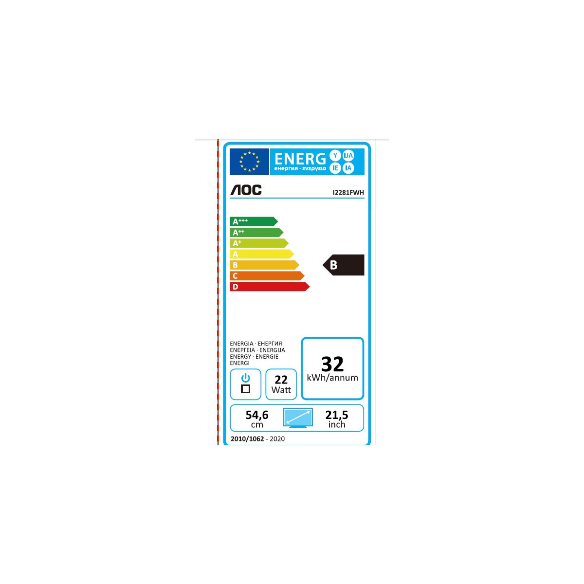 AOC Style-line I2281FWH. Dimensioni schermo: 54,6 cm (21.5"), Risoluzione del display: 1920 x 1080 Pixel, Tipologia HD: Full HD, Tecnologia display: LED, Superficie display: Opaco, Tempo di risposta: 4 ms, Rapporto d'aspetto nativo: 16:9, Angolo di visualizzazione (orizzontale): 178°, Angolo di visualizzazione (verticale): 178°. Certificazione Energy Star, Colore del prodotto: Nero, Argento