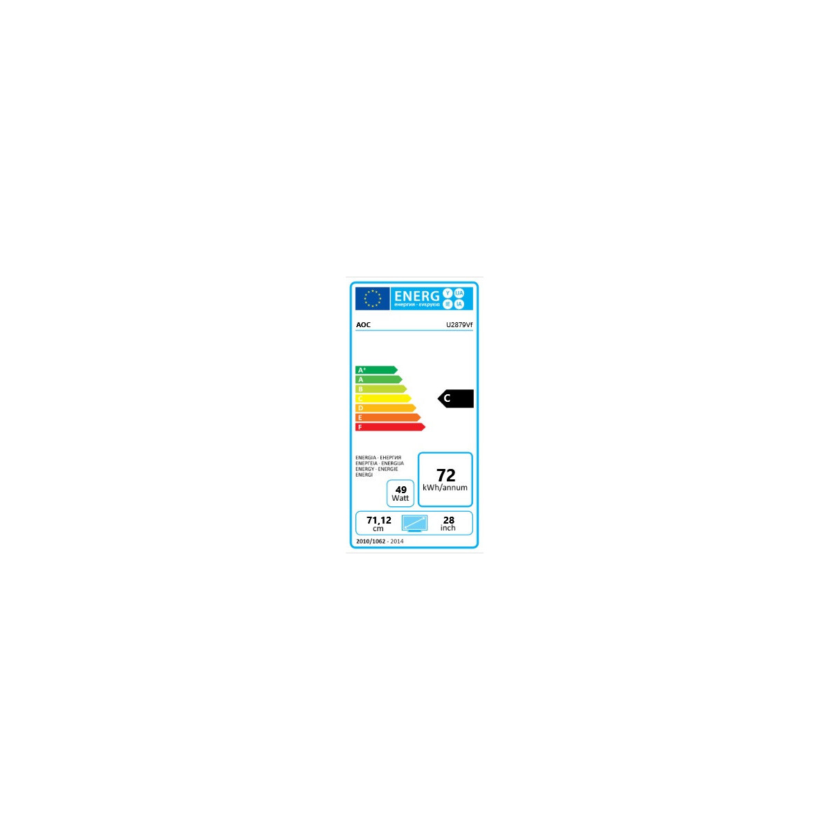 AOC Value-line U2879VF. Dimensioni schermo: 71,1 cm (28"), Risoluzione del display: 3840 x 2160 Pixel, Tipologia HD: 4K Ultra HD, Tecnologia display: LCD, Tempo di risposta: 1 ms, Rapporto d'aspetto nativo: 16:9, Angolo di visualizzazione (orizzontale): 170°, Angolo di visualizzazione (verticale): 160°. Certificazione Energy Star, Colore del prodotto: Nero