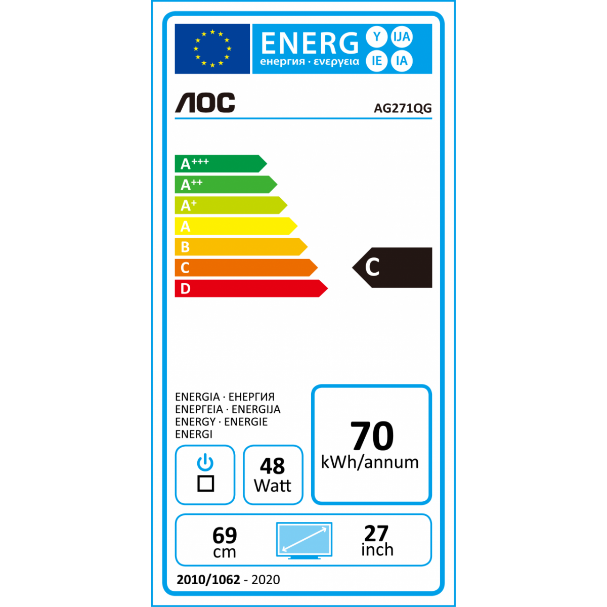 AOC Gaming AG271QG. Dimensioni schermo: 68,6 cm (27"), Risoluzione del display: 2560 x 1440 Pixel, Tipologia HD: Quad HD, Tecnologia display: LED, Tempo di risposta: 4 ms, Rapporto d'aspetto nativo: 16:9, Angolo di visualizzazione (orizzontale): 178°, Angolo di visualizzazione (verticale): 178°. Altoparlanti incorporati. Hub USB integrato, Versione dell'hub USB: 3.2 Gen 1 (3.1 Gen 1). Montaggio standard VESA, Regolazione altezza. Certificazione Energy Star, Colore del prodotto: Nero, Rosso