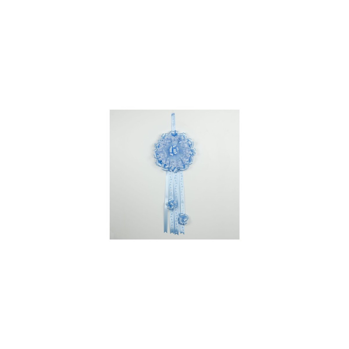 Coccarda Fiocco azzurro in tulle, nastro THT idrorepellente, nastro in poliestere, cartoncino colorato. Altezza 90 cm Larghezza 40 cm nastri compresi. Non esporre alle intemperie. Prodotto artigianale che potrebbe presentare differenze dalla foto perchè fatto manualmente