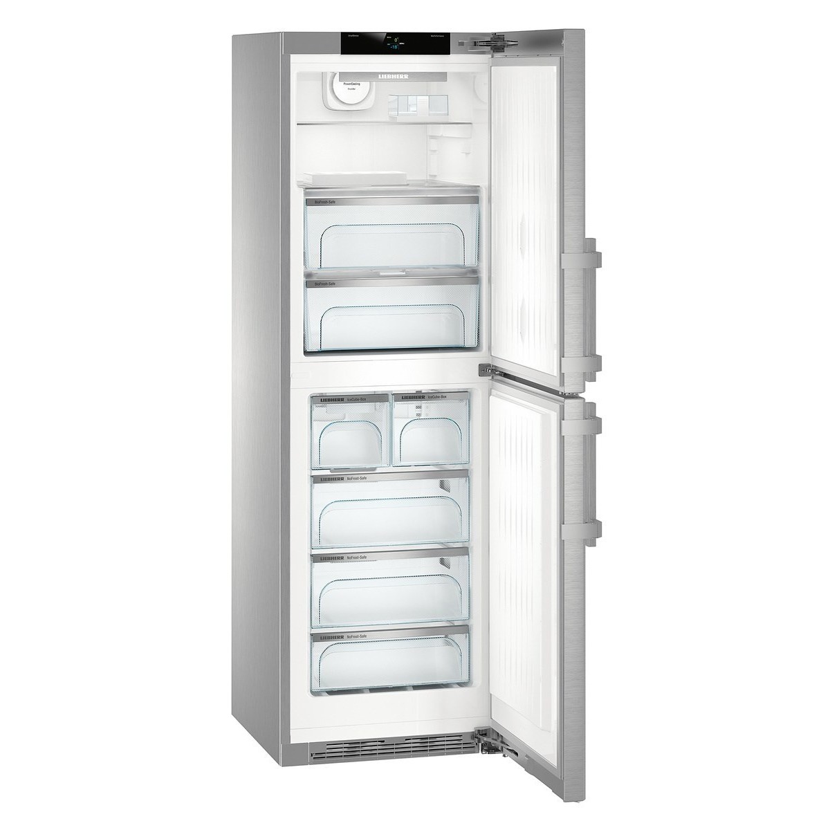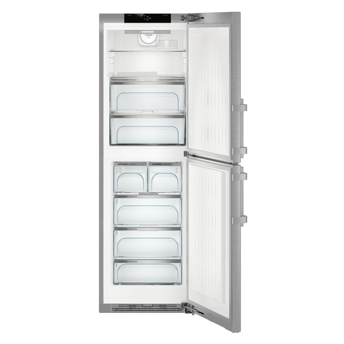 Liebherr SBNes 4285 Premium. Capacità netta totale: 312 L. Cerniera porta: Destra, Tipo di display: TFT. Classe climatica: SN-T, Emissione acustica: 38 dB. Capacità netta frigorifero: 156 L, Luce interna, Numero di ripiani frigorifero: 2. Capacità netta congelatore: 133 L, Capacità di congelamento: 16 kg/24h, No Frost (congelatore). Compartimento zona fresca. Classe efficienza energetica: D (A+++), Consumo energetico annuo: 188 kWh. Colore del prodotto: Acciaio inossidabile