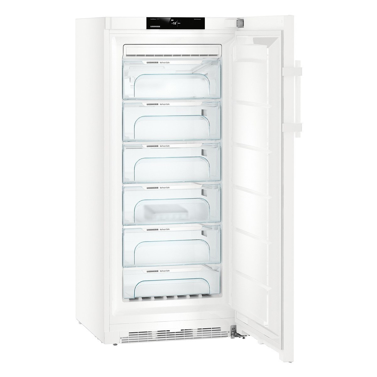 Liebherr GN4135-21. Tipo: Verticale. Capacità netta congelatore: 271 L, Classe climatica: SN-T, Capacità di congelamento: 22 kg/24h, Autonomia senza energia elettrica: 20 h, Emissione acustica: 39 dB, Punteggio: 4*, Sistema No-frost. Cerniera porta: Destra. Tipo di lampada: LED. Classe efficienza energetica: D (A+++), Consumo energetico annuo: 133 kWh. Colore del prodotto: Bianco