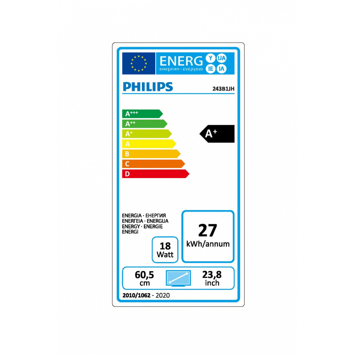 Philips B Line 243B1JH/00. Dimensioni schermo: 60,5 cm (23.8"), Risoluzione del display: 1920 x 1080 Pixel, Tipologia HD: Full HD, Tecnologia display: LCD, Superficie display: Opaco, Tempo di risposta: 4 ms, Rapporto d'aspetto nativo: 16:9, Angolo di visualizzazione (orizzontale): 178°, Angolo di visualizzazione (verticale): 178°. Altoparlanti incorporati. Hub USB integrato, Versione dell'hub USB: 3.2 Gen 1 (3.1 Gen 1). Montaggio standard VESA, Regolazione altezza. Colore del prodotto: Nero