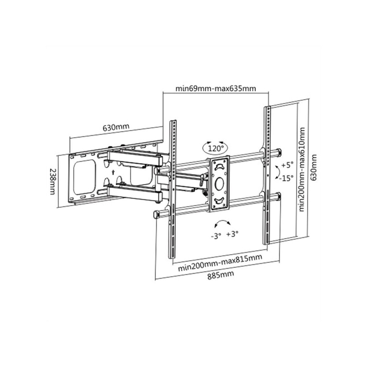 ITB RO17.99.1207. Adatto per: TV, Peso massimo (capacità): 75 kg, Capienza minima dimensioni dello schermo: 127 cm (50"), Capienza massima dimensioni dello schermo: 2,29 m (90"), Compatibilità interfaccia di montaggio (min): 200 x 200 mm, Compatibilità interfaccia di montaggio (max): 800 x 600 mm. Inclinazione: -15 - 5°, Angolo di rotazione: -60 - 60°, Distanza dalla parete (min): 6,9 cm, Distanza dal muro (massima): 63,5 cm. Colore del prodotto: Nero