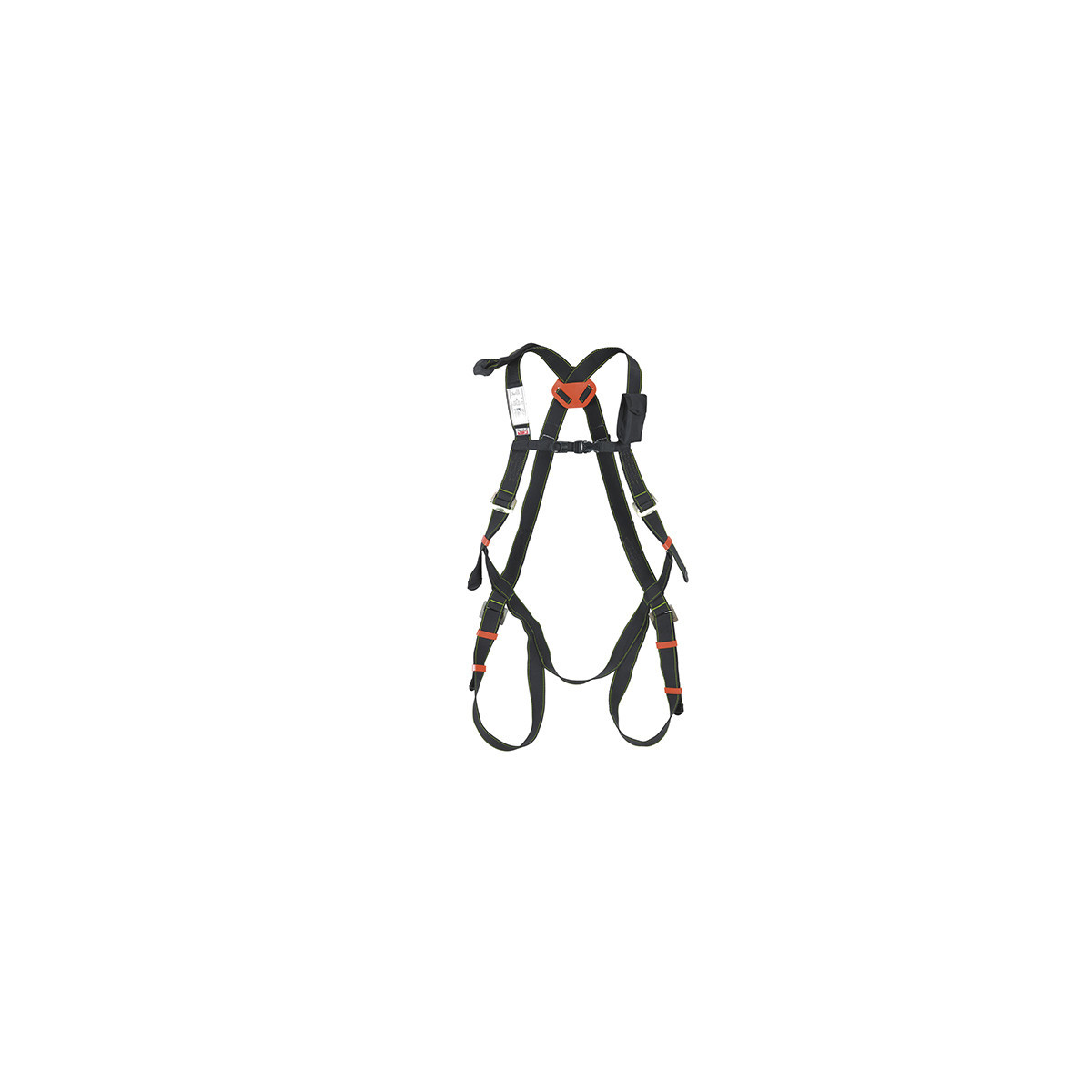 Imbragatura elasticizzata per il massimo comfort. Punti di ancoraggio: frontale. Accessori: doppia regolazione, porta telefono, cinghia sottoglutei, fibbia di prolungamento trattenuta dorsale. Tester di caduta.