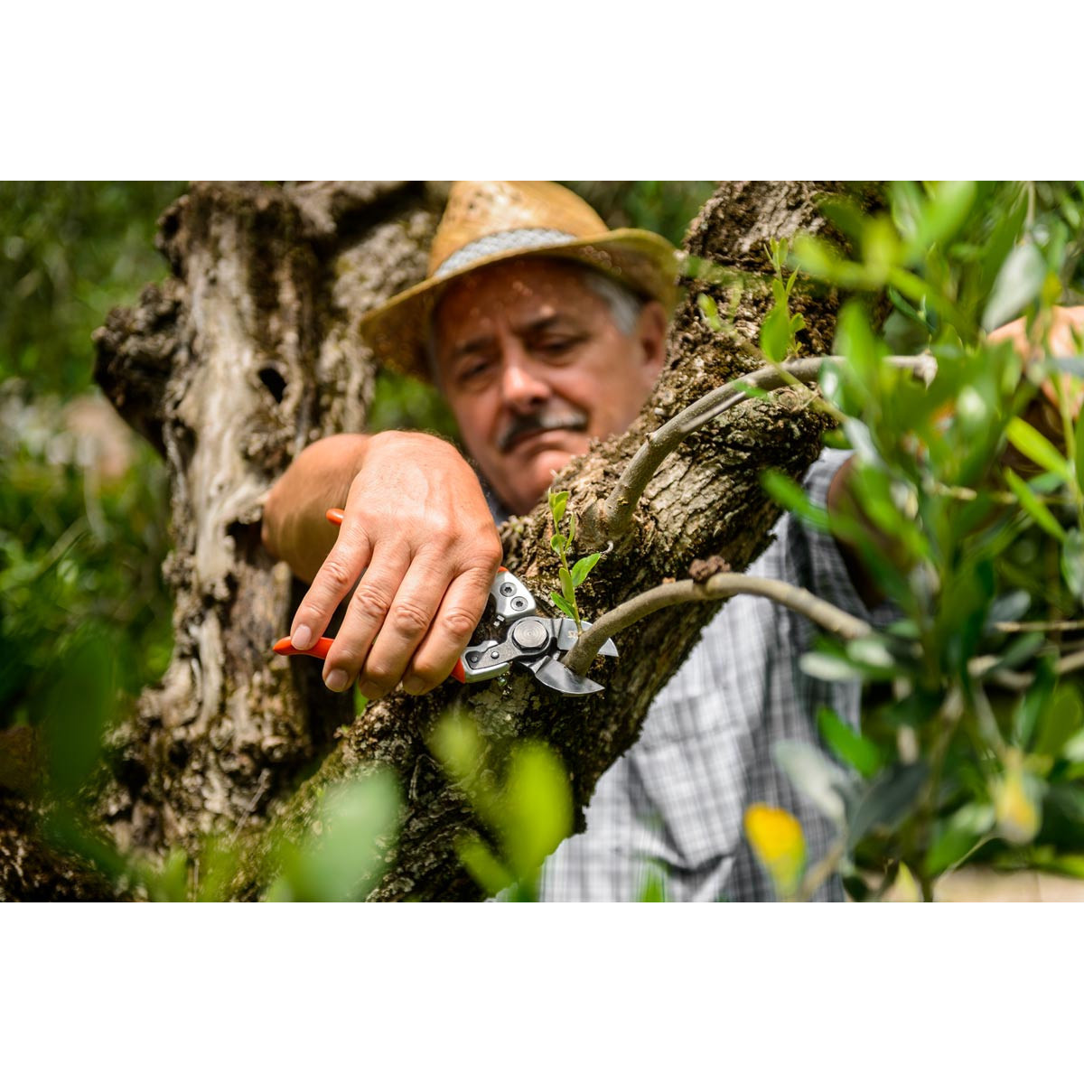 Forbice a doppio taglio, perfetta per la potatura delle piante da frutto e degli olivi. Il peso estremamente leggero di soli 240 g e la forma ergonomica del manico diminuiscono l'affaticamento della mano dell'operatore.