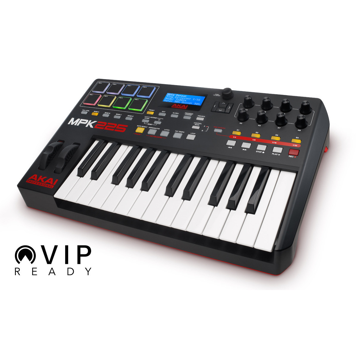 Akai MPK225. Tipo alimentazione: USB. Larghezza: 489 mm, Profondità: 92 mm, Altezza: 298 mm. Software forniti: Ableton Live Lite, Hybrid 3 by AIR Music Tech, SONiVOX Twist 2.0 & Akai Pro MPC Essentials...