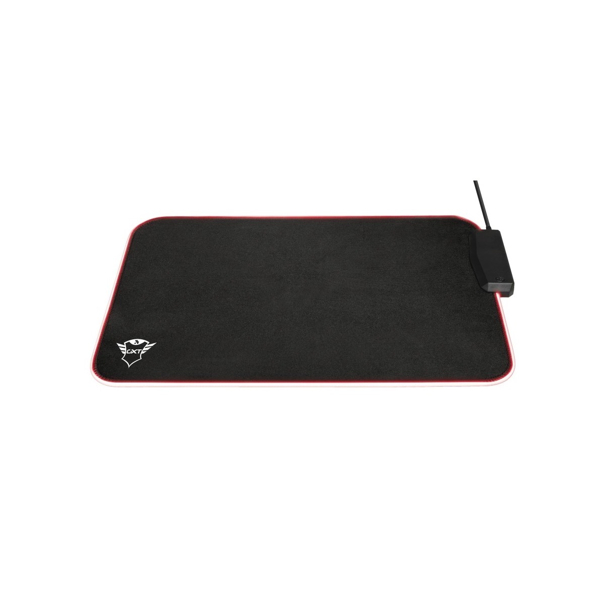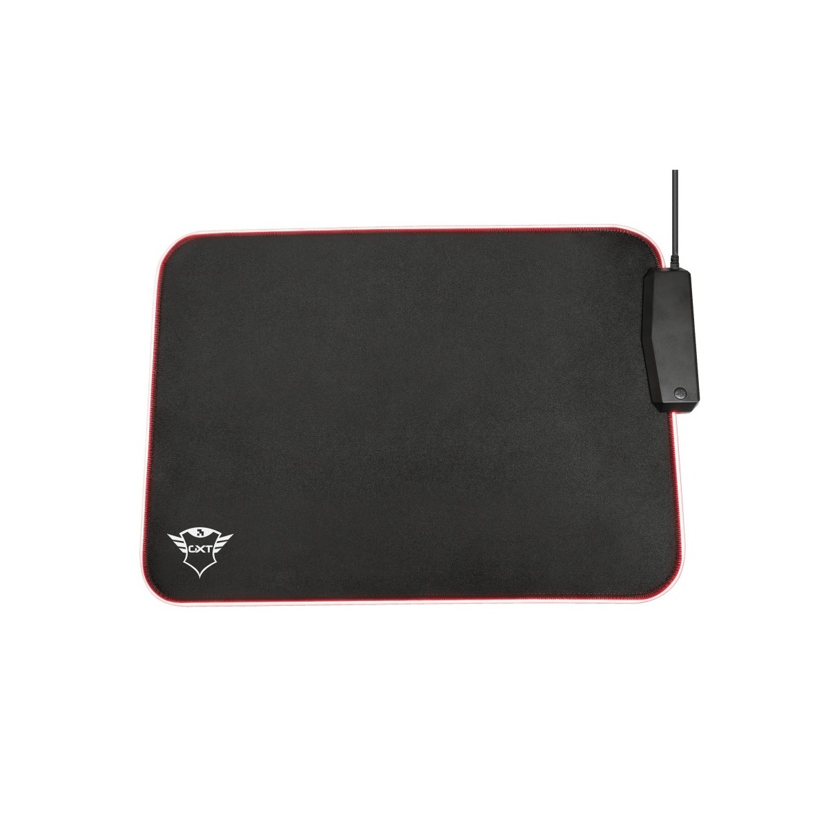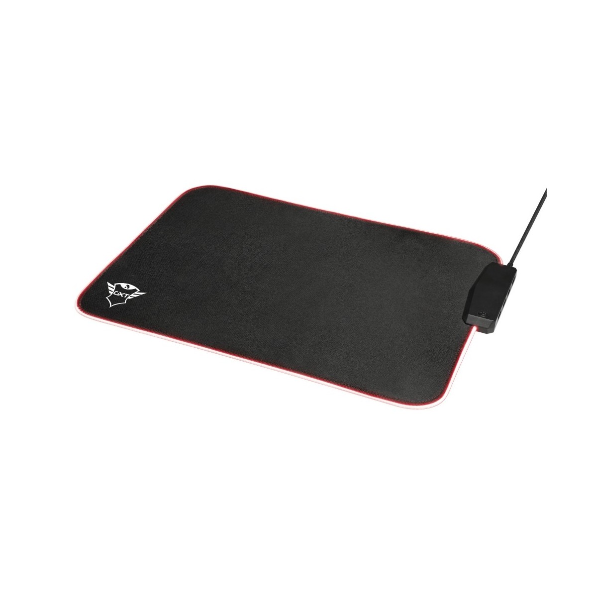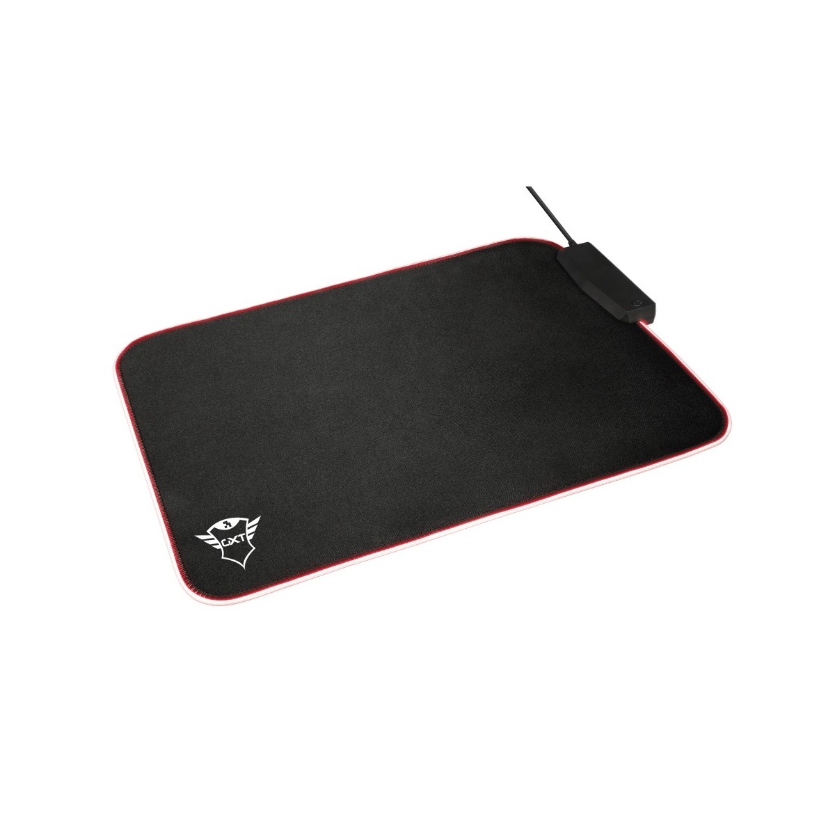Trust 23646. Larghezza: 250 mm, Profondità: 350 mm. Colore del prodotto: Nero, Rosso, Colorazione superficie: Monocromatico, Materiali: Nylon, Gomma, Alimentazione USB, Colore retroilluminazione: Rosso, Bordi cuciti, Barra appoggiaferro antiscivolo, Tappetino per mouse per gioco da computer