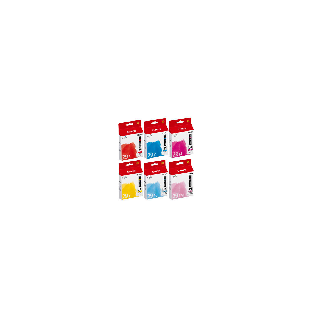 Canon PGI-29 C/M/Y/PC/PM/R. Tipo: Originale, Tipo di inchiostro: Inchiostro a base di tintura/Inchiostro a base di pigmento, Colori di stampa: Ciano, Magenta, Ciano per foto, Magenta per foto, Rosso, Giallo. Tipo di imballo: Blister
