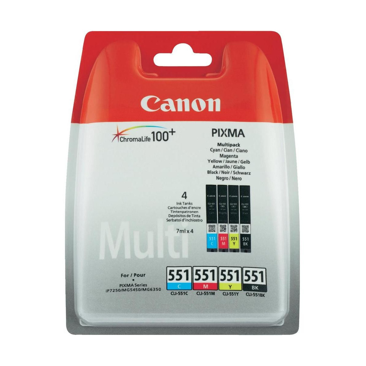 Canon CLI-551 C/M/Y/BK w/sec. Tipo: Originale, Tipo di inchiostro: Inchiostro a base di pigmento, Colori di stampa: Nero, Ciano, Magenta, Giallo. Tipo di imballo: Blister. Produzione pagine note a piè di pagina: ISO/IEC 24734