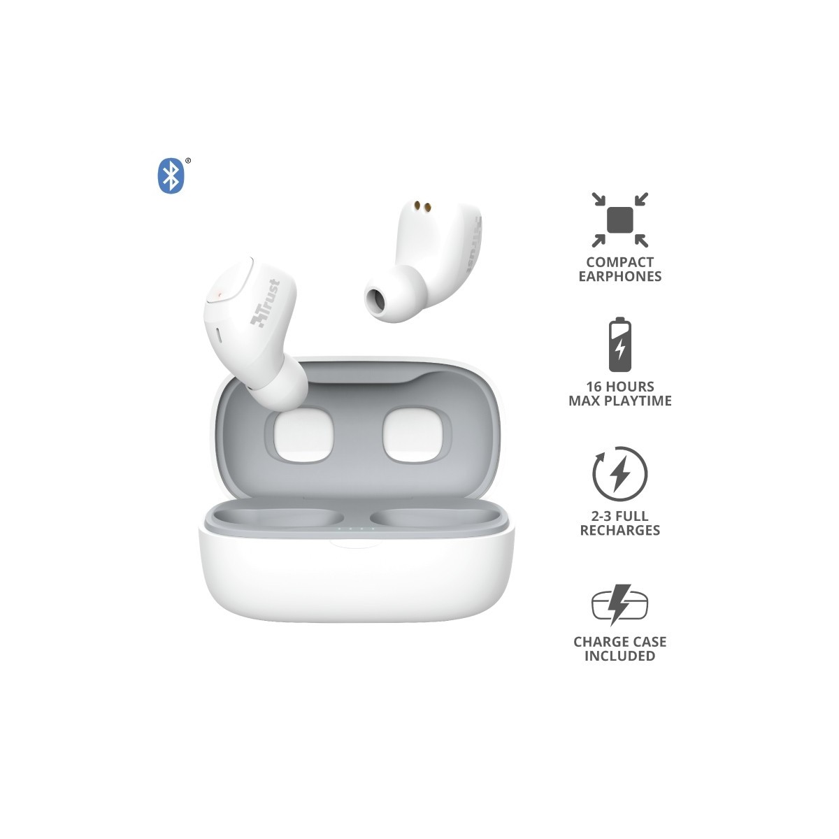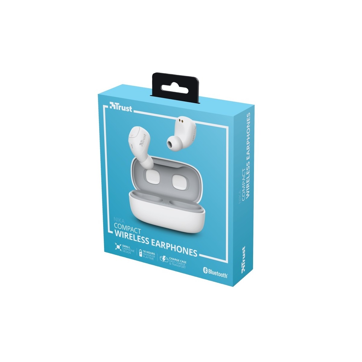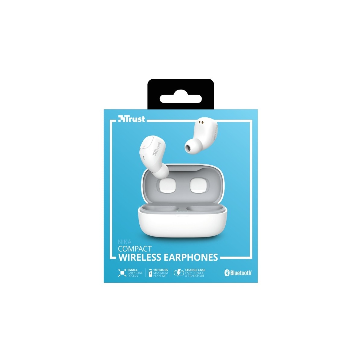Trust Nika Compact. Tipo di prodotto: Cuffia, Stile d'uso: Auricolare, Utilizzo raccomandato: Chiamate e musica. Tecnologia di connessione: Senza fili, Profili Bluetooth: A2DP,AVRCP,HFP, Range wireless: 10 m. Disegno auricolare: Intraurale, Frequenza cuffia: 20 - 20000 Hz, Sensibilità cuffia: 96 dB. Tipo di microfono: Integrata, Frequenza microfono: 80 - 8000 Hz, Tipo direzionamento microfono: Omnidirezionale. Durata batteria: 8 h, Tempo di riproduzione audio continuo (con alloggiamento di ricarica): 18 h, Tecnologia della batteria (custodia di ricarica): Ioni di Litio