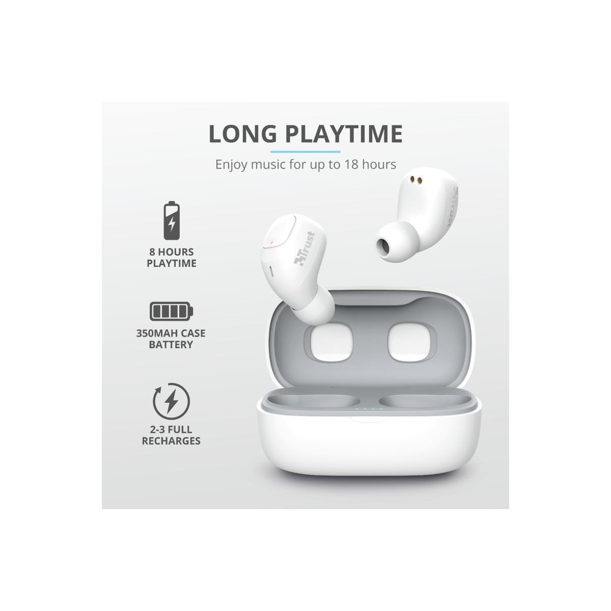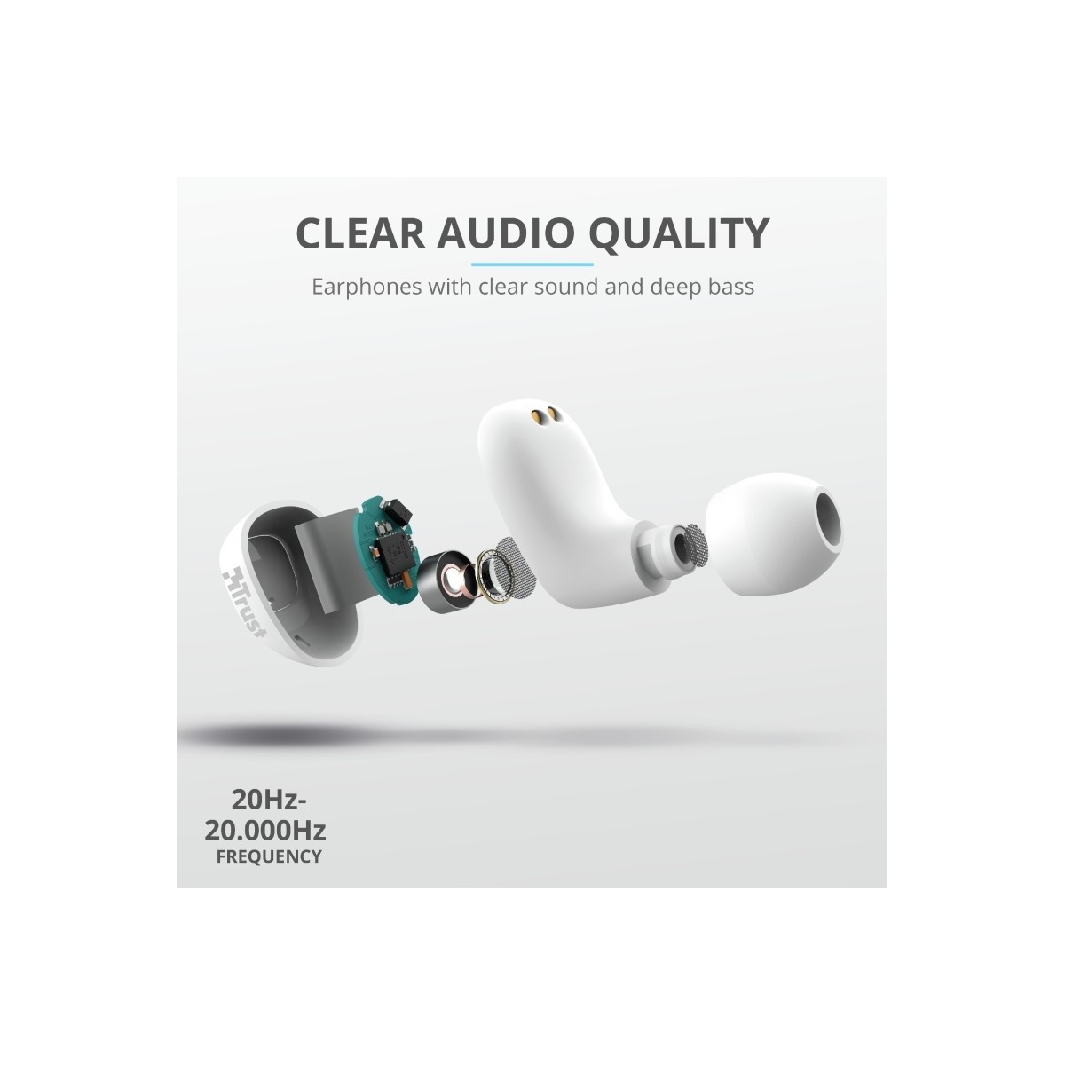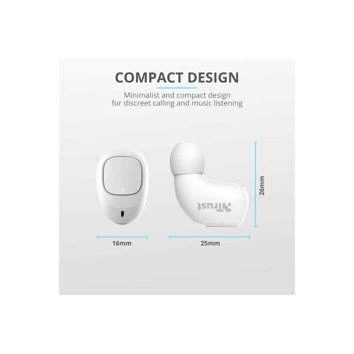 Trust Nika Compact. Tipo di prodotto: Cuffia, Stile d'uso: Auricolare, Utilizzo raccomandato: Chiamate e musica. Tecnologia di connessione: Senza fili, Profili Bluetooth: A2DP,AVRCP,HFP, Range wireless: 10 m. Disegno auricolare: Intraurale, Frequenza cuffia: 20 - 20000 Hz, Sensibilità cuffia: 96 dB. Tipo di microfono: Integrata, Frequenza microfono: 80 - 8000 Hz, Tipo direzionamento microfono: Omnidirezionale. Durata batteria: 8 h, Tempo di riproduzione audio continuo (con alloggiamento di ricarica): 18 h, Tecnologia della batteria (custodia di ricarica): Ioni di Litio