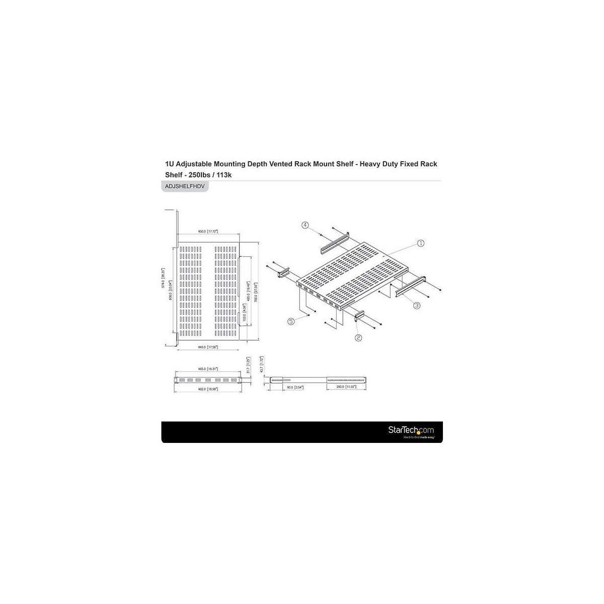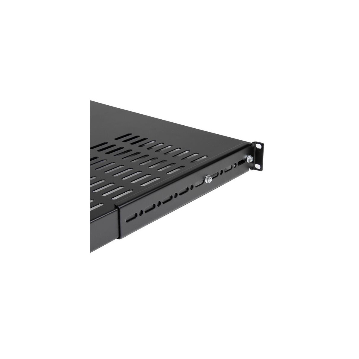 Questo resistente ripiano per montaggio a rack può essere regolato da 19,5" a 38" (profondità di montaggio) adattandosi al rack mentre il design con fessure migliora il flusso d'aria favorendo il mantenimento di basse temperature nel rack. Realizzato in acciaio pressato a freddo SPCC di tipo commerciale da 1,2 mm, offre la possibilità di sostenere attrezzature con un peso massimo di 113 kg: una resistente soluzione per l'alloggiamento di apparecchiature non montabili in rack con fattore di forma di dimensioni maggiori, strumenti o periferiche pesanti nel rack o nell'armadio.