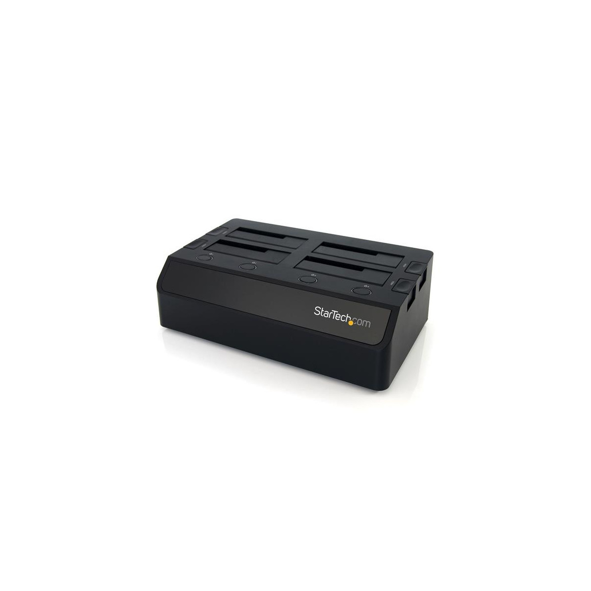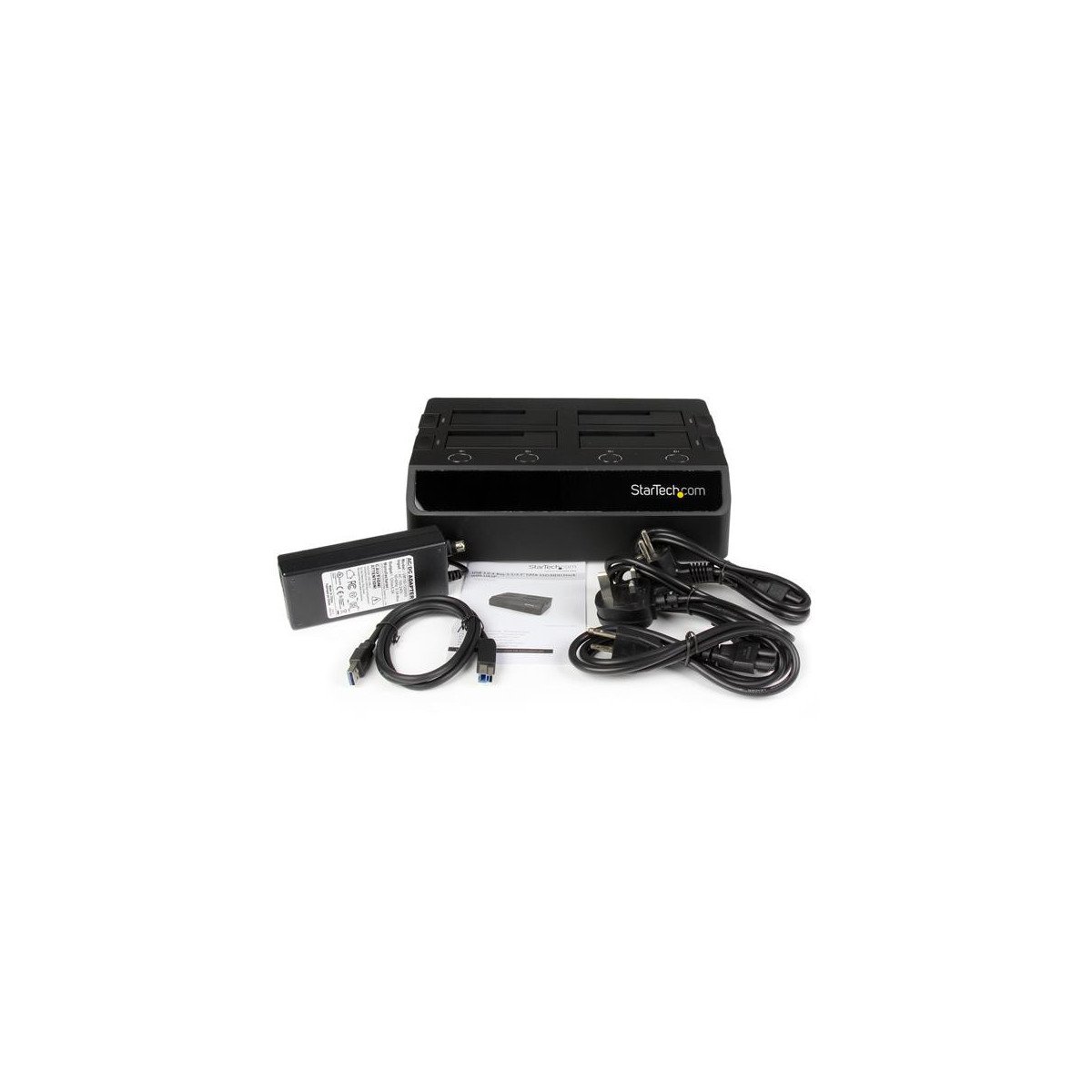 StarTech.com Base de Acoplamiento USB 3.0 con 4 Bahías SATA 6Gbps de 2.5 y 3.5 Pulgadas - Docking Station para HDD SSD. Tipologia disco rigido: HDD, SSD, Interfaccia dispositivo di archiviazione: SATA, Seriale ATA II, Serial ATA III, Dimensioni dei dispositivi di archivio supportati: 2.5,3.5". Interfaccia host: USB 3.2 Gen 1 (3.1 Gen 1) Type-B. Massima velocità di trasferimento: 6 Gbit/s, Colore del prodotto: Nero, Materiali: Plastica. Numero di ventole: 2 ventola(e), Diametro del ventilatore: 4 cm. Tensione di ingresso AC: 100-240 V, Corrente d'ingresso: 2.5 A, Voltaggio di uscita: 12 V