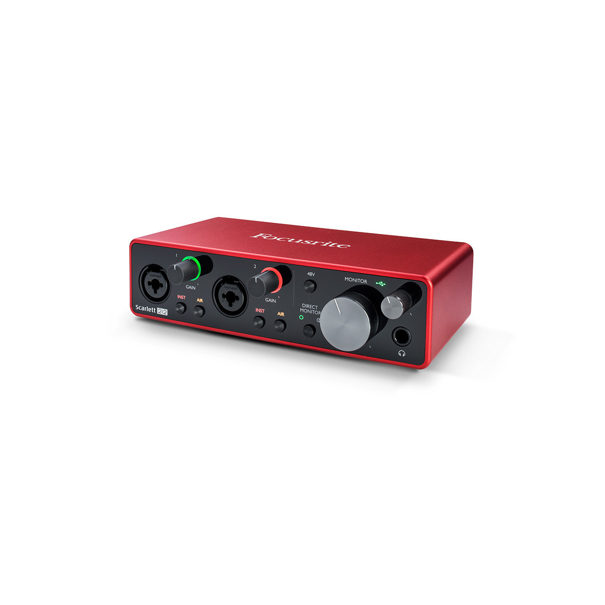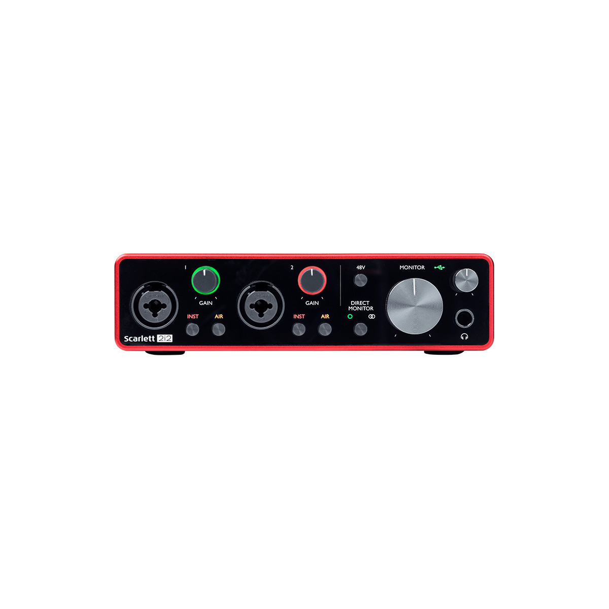 Focusrite SCARLETT 2I2 3RD GENERATION. Fattore di forma: Desktop, Indicatori LED: Potenza. Interfaccia dispositivo: USB. Guadagno in preamplificazione del microfono: 56 dB, Livello di ingresso della preamplificazione del microfono (max): 9 dBu, Impedenza di uscita del pre-amplificatore per microfono: 3000 Ω. Convertitore A/D Audio (ADC): 24-bit/192kHz, Frequenze di campionamento supportate: 44.1,48,88.2,96,176.4,192 kHz. Alimentazione: USB