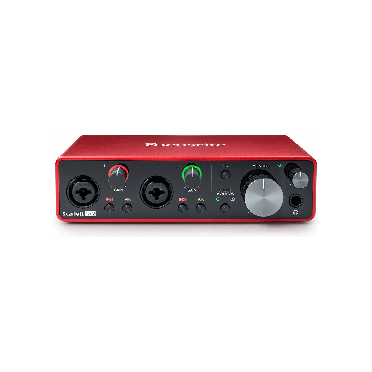 Focusrite SCARLETT 2I2 3RD GENERATION. Fattore di forma: Scrivania, Indicatori LED: Potenza. Interfaccia dispositivo: USB. Guadagno in preamplificazione del microfono: 56 dB, Livello di ingresso della preamplificazione del microfono (max): 9 dBu, Impedenza di uscita del pre-amplificatore per microfono: 3000 Ω. Convertitore A/D Audio (ADC): 24-bit/192kHz, Frequenze di campionamento supportate: 44.1,48,88.2,96,176.4,192 kHz. Alimentazione: USB