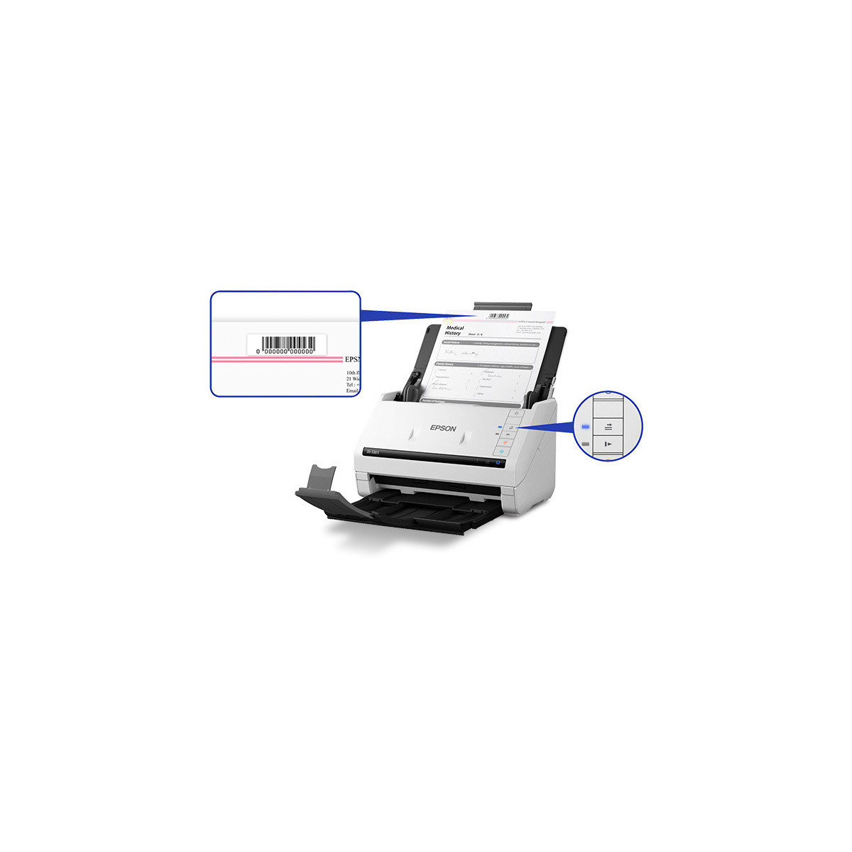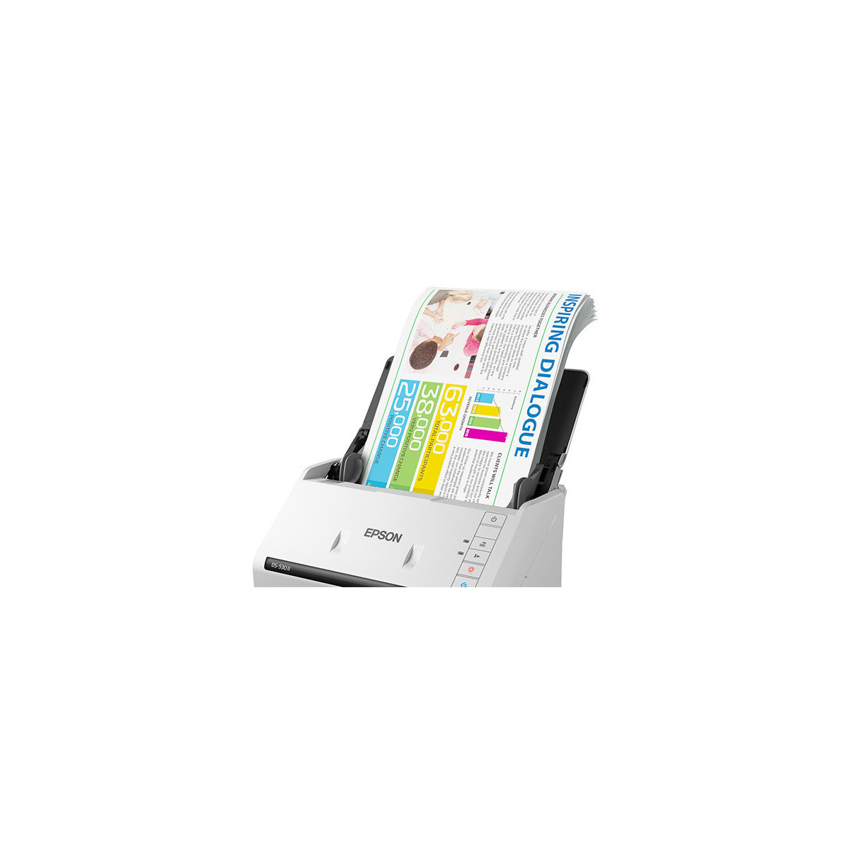 Epson DS-530 II. Massima dimensione di scansione: 215,9 x 6096 mm, Risoluzione di scansione ottica: 1200 x 1200 DPI, Profondità di scansione del colore in entrata: 30 bit. Tipo di scansione: Scanner ADF, Colore del prodotto: Bianco. Tipo sensore: CIS, Ciclo di funzionamento quotidiano (max): 4000 pagine, Fonte di luce: LED RGB. Capacità documenti: 50 fogli. Peso supporto, alimentazione manuale: 27 - 413 g/m²