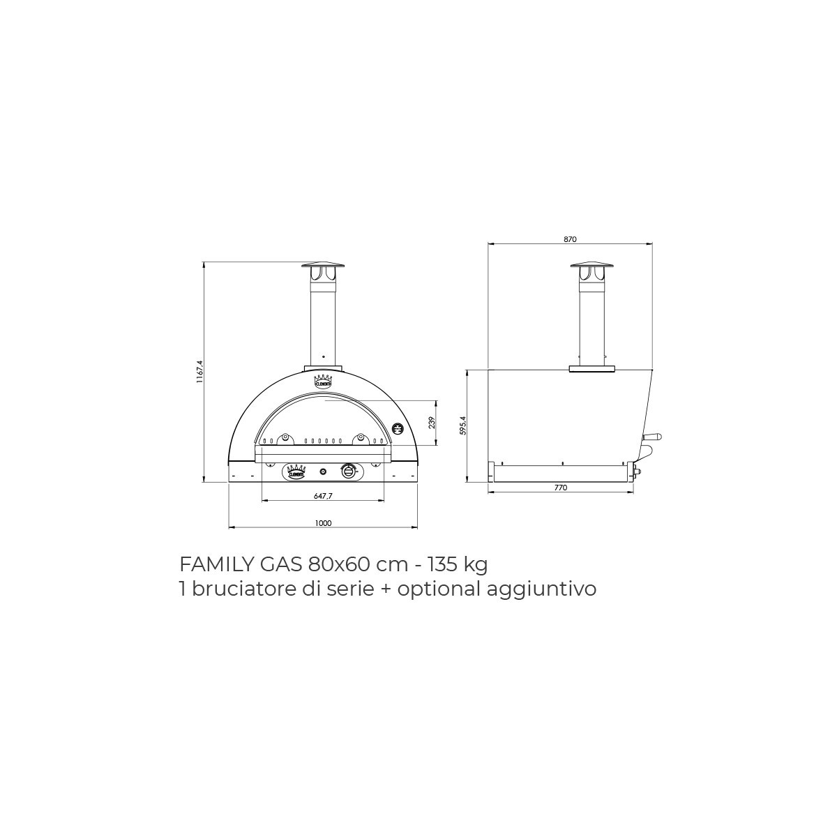Dimensioni camera di cottura: 80x60 un bruciatore (il secondo opzionale) (4 pizze) sono disponibili altri formati