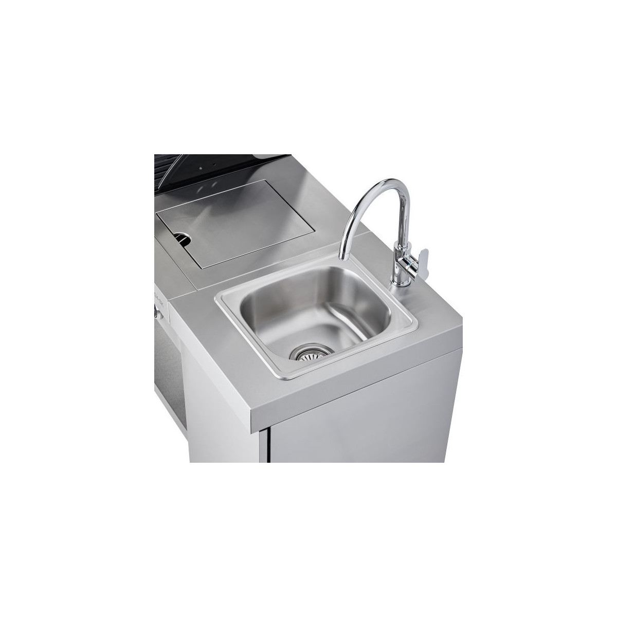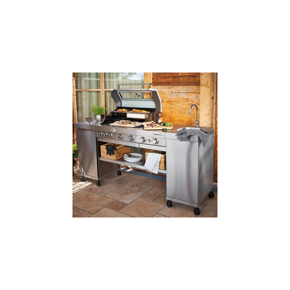 Bruciatore a infrarossi (3,0 kW/10,919 BTU), Termometro nel coperchio, Lavabo in Acciaio Inox con rubinetto, Porta USB per Led Grill Rack opzionale, Griglie in ghisa smaltata, Ruote con freno di stazionamento