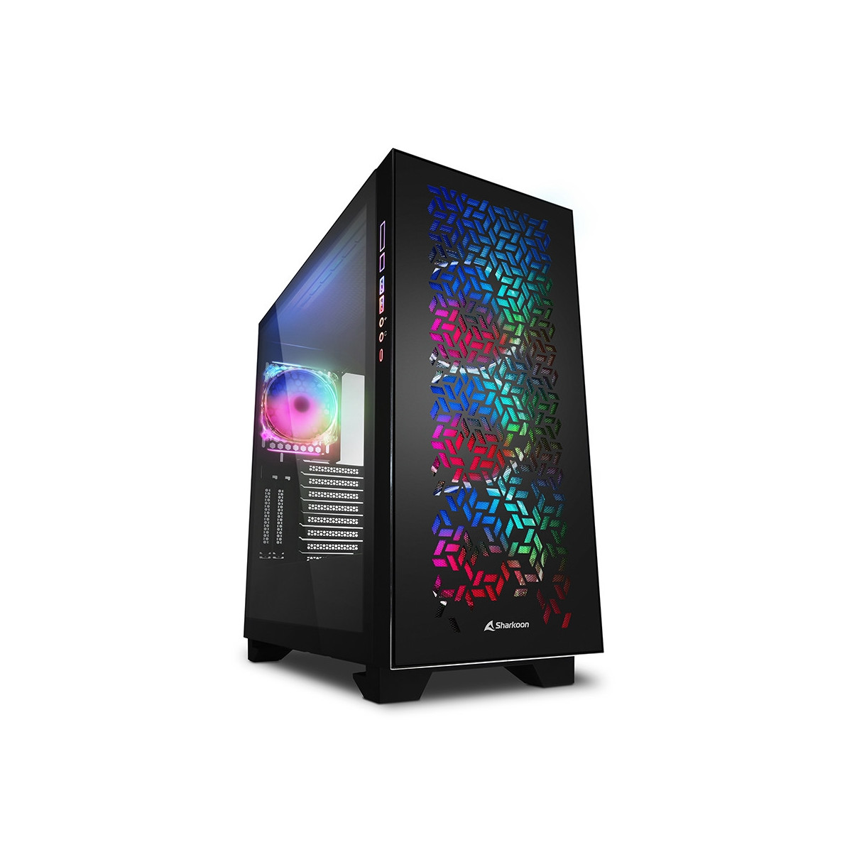 L’ELITE SHARK CA300H può fare bella mostra di sé in ogni studio o in ogni stanza dedicata al gaming grazie al suo design impeccabile, al suo layout intelligente e al suo splendido pannello frontale. I pannelli laterali in vetro temperato garantiscono una visuale sugli interni del case, progettati con cura. Il pannello di entrata/uscita con illuminazione RGB si integra perfettamente con il look dei LED; grazie alle aperture parallele sul pannello frontale in acciaio, le ventole a LED RGB e i loro giochi di luce coloratissimi danno vita a uno spettacolo meraviglioso.