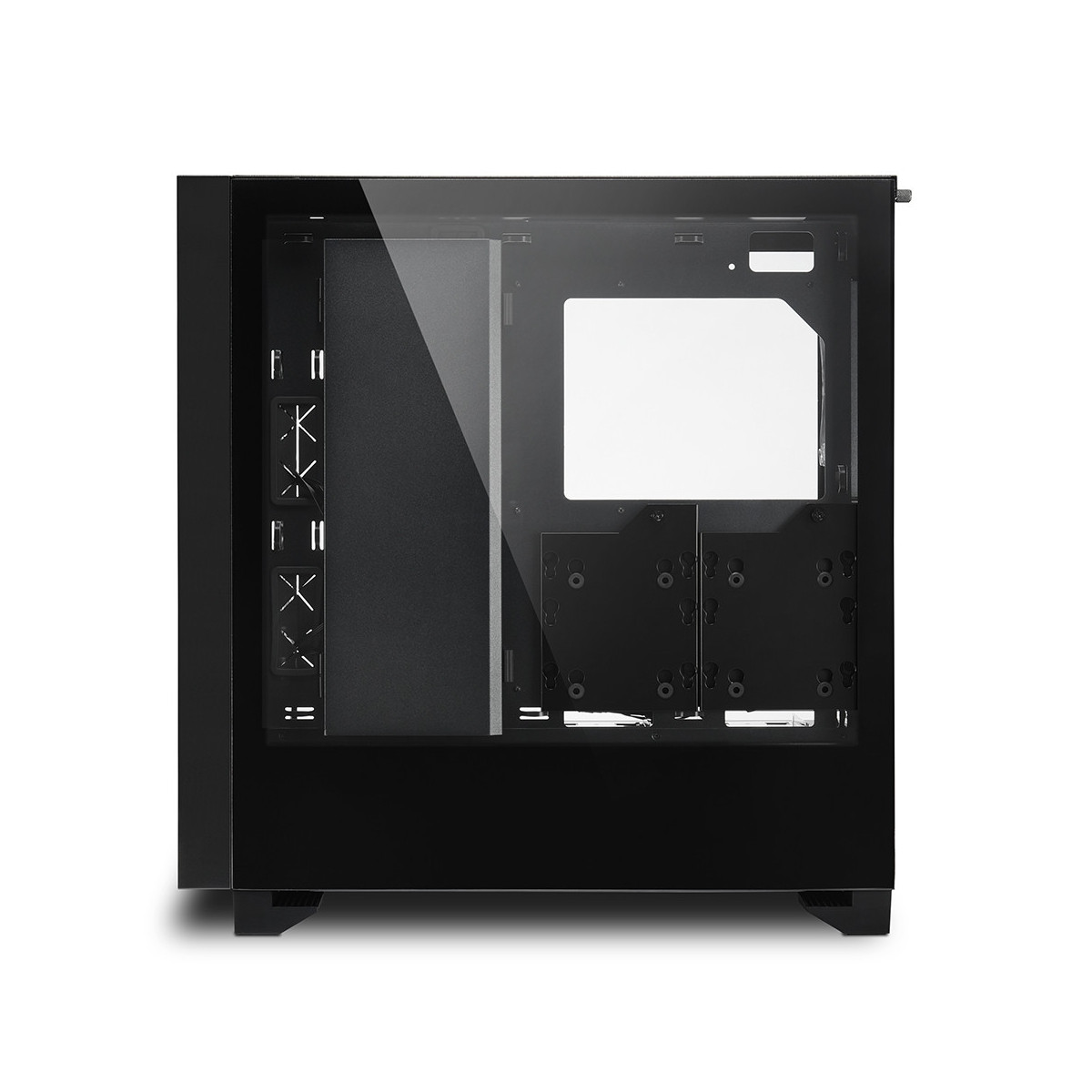Componenti di alta qualità con un design stiloso. L'hardware costruito all'interno di un case ELITE SHARK merita di essere messo in mostra. Per questo abbiamo dotato il CA300H di due pannelli laterali in vetro temperato. Il pannello sul lato sinistro fornisce una visione completa dell'interno del case, così da esporre le componenti installate nel modo più chiaro possibile. La parte più in basso del vetro temperato del pannello destro è dipinta di nero, cosicché i componenti all'interno del tunnel per l'alimentatore non distraggano l'attenzione dall'impatto visivo del case. Eventuali SSD con elementi RGB o imponenti HDD si inseriscono perfettamente negli alloggi. Dimentica i grovigli di fili: Tutta la cavetteria scompare all'interno di un vano spazioso che può essere aperto e chiuso e dietro un copri cavi mobile. Per evitare di avere elementi superflui nel campo visivo, i pannelli laterali non presentano viti sulla superficie o sulla porzione posteriore e possono essere collegati al case in modo semplice, grazie ad alcuni passaggi veloci.