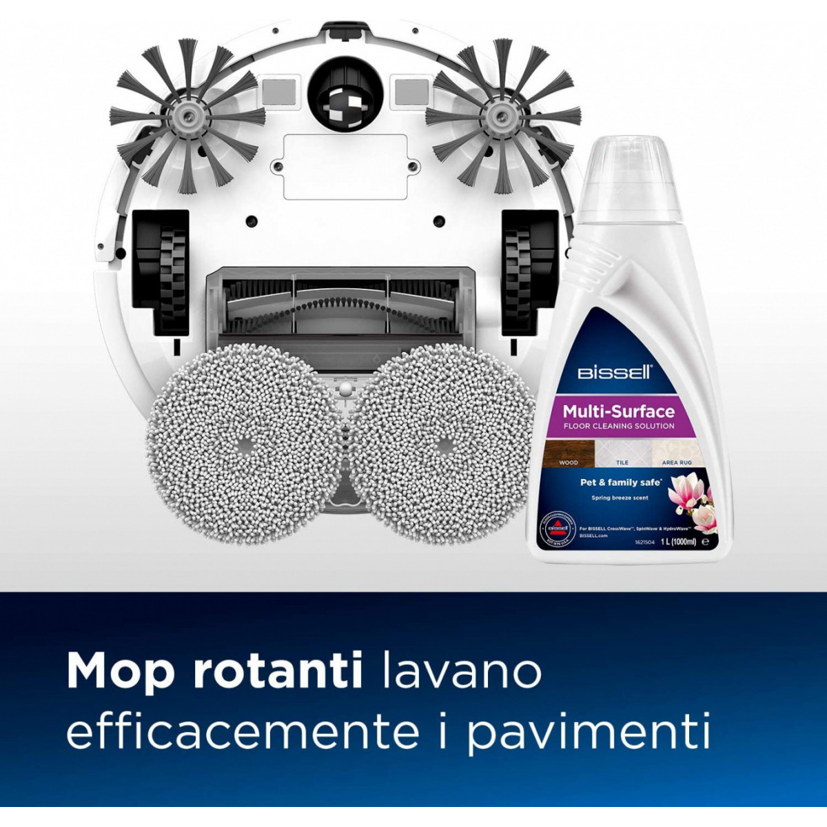 Il robot BISSELL® SpinWave® è un lavapavimenti multifunzione a tutti gli effetti. Combina infatti due funzioni in una: dopo aver attivato il contenitore del secco, il robot fornirà fino a 130 minuti di potente aspirazione. La spazzola rotante, la potenza di aspirazione pari a 1.500 Pa e le spazzole laterali garantiscono una pulizia efficace su diversi tipi di pavimento, da moquette e tappeti a piastrelle, laminato, legno e altro ancora. Per una pulizia più accurata dei pavimenti duri, è sufficiente sostituire il contenitore dello sporco secco con il serbatoio per la pulizia a umido collegandovi i panni rotanti. Il robot pulirà quindi attivamente i tuoi pavimenti duri utilizzando il movimento dei mop pads e la formula detergente proprietaria di BISSELL®. La soluzione detergente va applicata in quantità adeguata sui panni e non direttamente sulla superficie da pulire, per evitare il rischio di applicare troppo liquido su pavimenti delicati. Niente più mocio e secchio per le tue pulizie! Il robot BISSELL® SpinWave® è dotato di navigazione giroscopica che garantisce una pulizia intelligente e strutturata su tutti i pavimenti. Affronta lo sporco ostinato più volte in modalità Spot, rileva ed evita moquette e tappeti nella modalità Pulizia a umido. Con l'aiuto dell'app BISSELL® Connect, puoi programmare il tuo robot e personalizzare la tua esperienza di pulizia scegliendo diverse modalità e una delle tre velocità (bassa, media, alta) per adattarle ai tuoi pavimenti e soddisfare le tue esigenze di pulizia. BISSELL Mobile App è disponibile solo in questi paesi: Germania, Francia, Italia, Spagna, Portogallo.Il robot pulirà quindi attivamente i tuoi pavimenti duri utilizzando il movimento dei mop pads e la formula detergente proprietaria di BISSELL®. La soluzione detergente va applicata in quantità adeguata sui panni e non direttamente sulla superficie da pulire, per evitare il rischio di applicare troppo liquido su pavimenti delicati. Con un serbatoio dell'acqua è possibile pulire una superficie di oltre 55 m². Niente più mocio e secchio per le tue pulizie!
