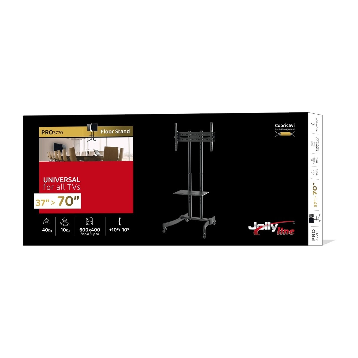 G.B.S. Elettronica PRO-3770. Peso massimo (capacità): 40 kg, Capienza minima dimensioni dello schermo: 94 cm (37"), Capienza massima dimensioni dello schermo: 177,8 cm (70"), Compatibilità interfaccia di montaggio (max): 600 x 400 mm. Range di regolazione altezza: 1555 - 1715 mm, Inclinazione: -10 - 10°. Colore del prodotto: Nero