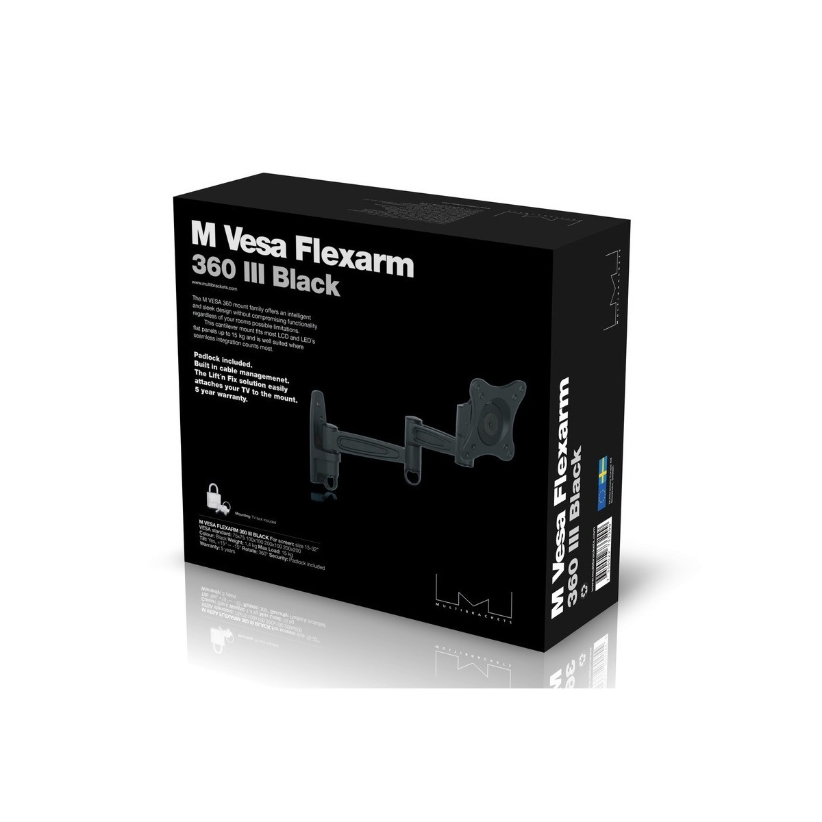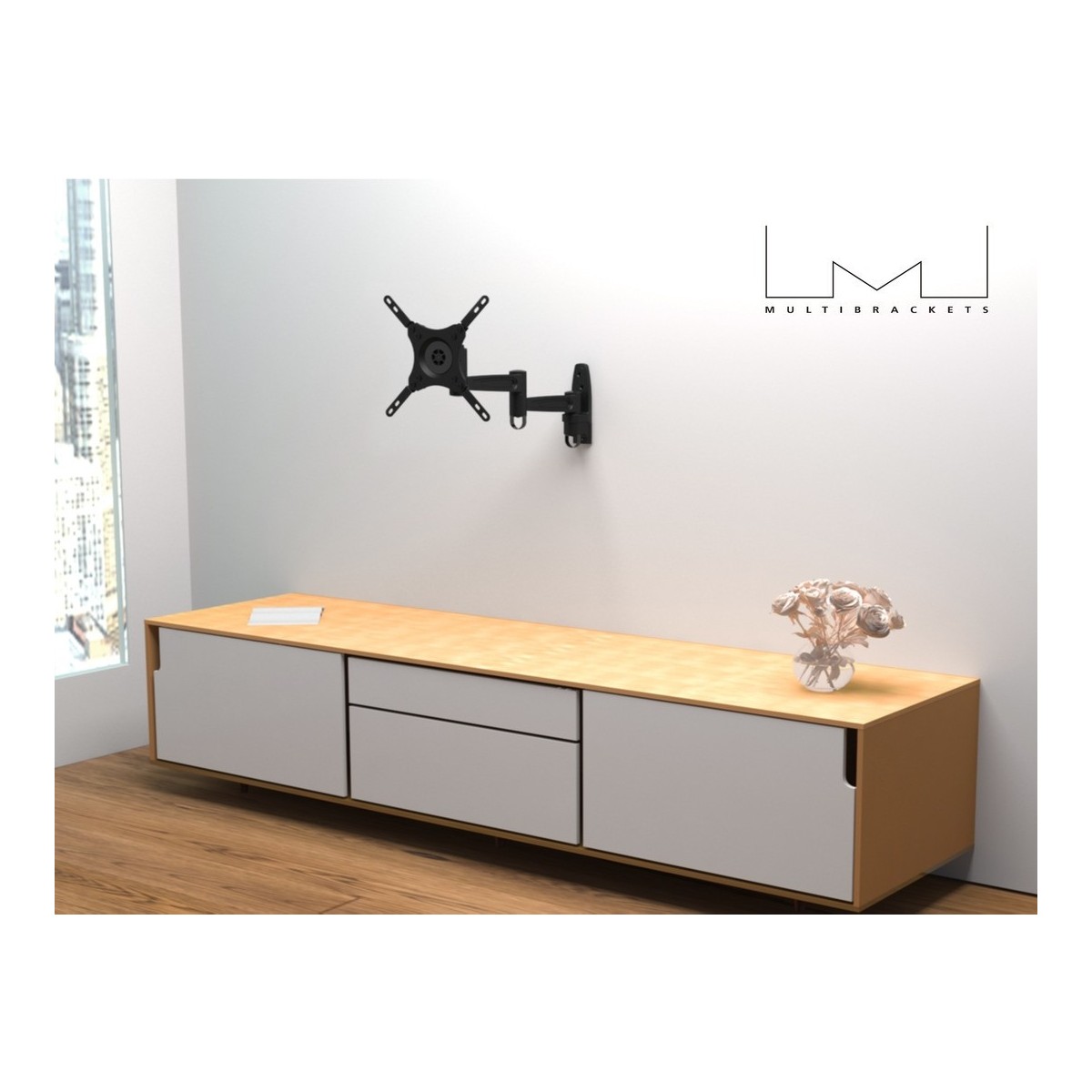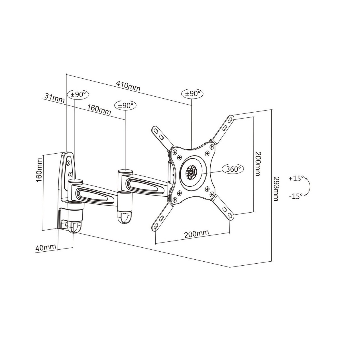 Multibrackets 3299. Peso massimo (capacità): 15 kg, Capienza minima dimensioni dello schermo: 38,1 cm (15"), Capienza massima dimensioni dello schermo: 81,3 cm (32"), Compatibilità interfaccia di montaggio (min): 75 x 75 mm, Compatibilità interfaccia di montaggio (max): 200 x 200 mm. Inclinazione: -15 - 15°, Angolo di rotazione: 360°, Distanza dalla parete (min): 8 cm, Distanza dal muro (massima): 41,8 cm. Colore del prodotto: Nero