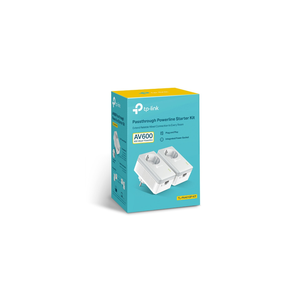 TP-LINK TL-PA4010P KIT V5. Velocità massima di trasferimento dati: 600 Mbit/s, Standard di rete: IEEE 802.3,IEEE 802.3u, Tipo di interfaccia LAN Ethernet: Fast Ethernet. Consumi: 4,6 W, Consumi (modalità stand-by): 0,72 W. Colore del prodotto: Bianco, Certificazione: FCC, CE. Larghezza: 95 mm, Profondità: 58 mm, Altezza: 67 mm. Quantità per pacco: 2 pezzo(i), Cavi inclusi: LAN (RJ-45)