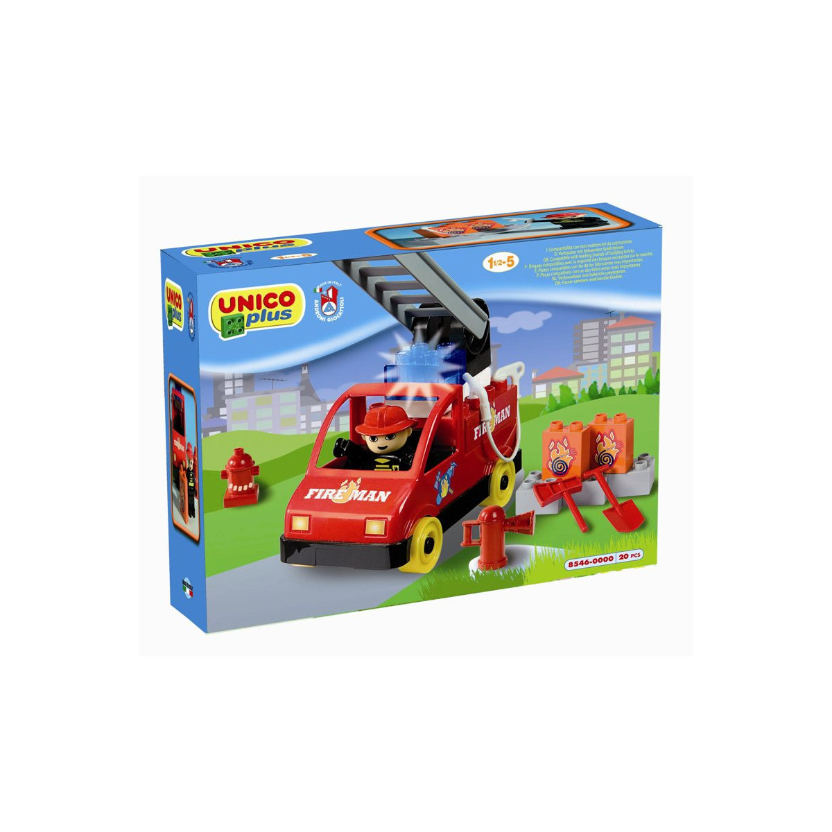 Androni Giocattoli Scatola Costruzioni Unico 20 Pezzi Pompieri 8546. Compatibile con noti mattoncini da costruzione-Contiene: 1 personaggio di pompiere, 1 macchina dei pompieri con scala, mattoncini da decorare e accessori-Numero totale di pezzi: 20-Made in Italy