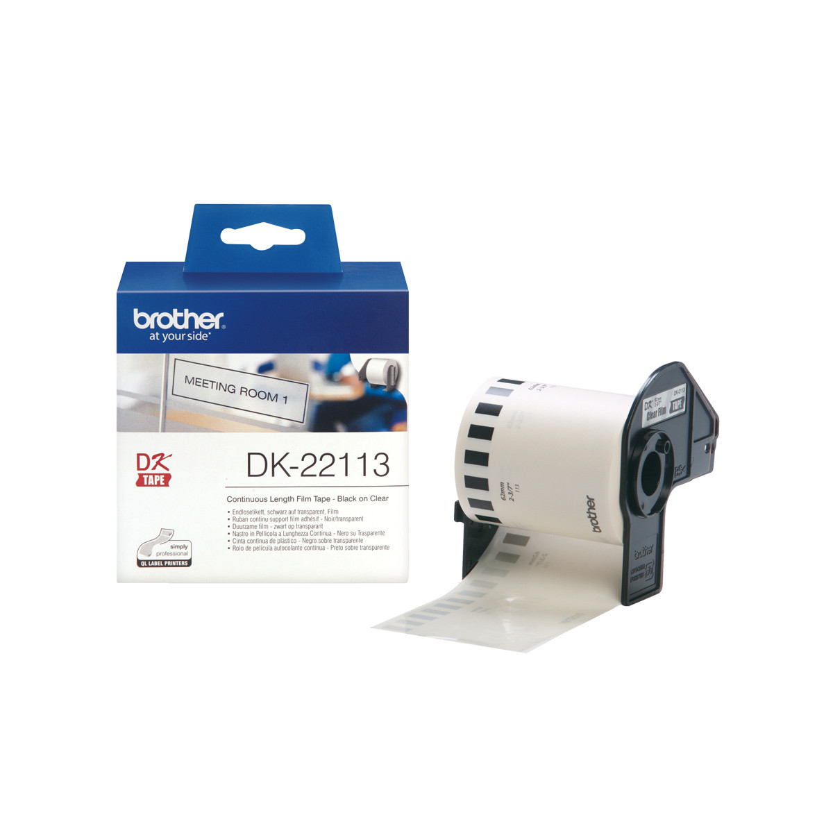 Brother Nastro pellicola a lunghezza continua bianco. Colore etichetta: Nero trasparente, Tipo nastro: DK, Colore del prodotto: Trasparente. Ampiezza nastro: 6,2 cm, Lunghezza nastro: 15,24 m