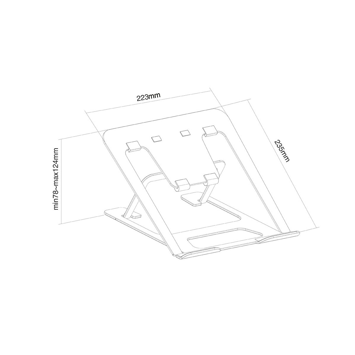 Newstar Supporto per laptop. Tipo di prodotto: Supporto per computer portatile, Colore del prodotto: Nero, Dimensione minima compatibile dello schermo del notebook: 25,4 cm (10"). Range di regolazione altezza: 78 - 124 mm, Inclinazione: 0 - 36°. Larghezza: 223 mm, Profondità: 235 mm, Altezza: 124 mm. Larghezza imballo: 240 mm, Profondità imballo: 30 mm, Altezza imballo: 240 mm. Larghezza scatola principale: 36,5 cm, Lunghezza del cartone principale: 25 cm, Altezza scatola principale: 54,4 cm