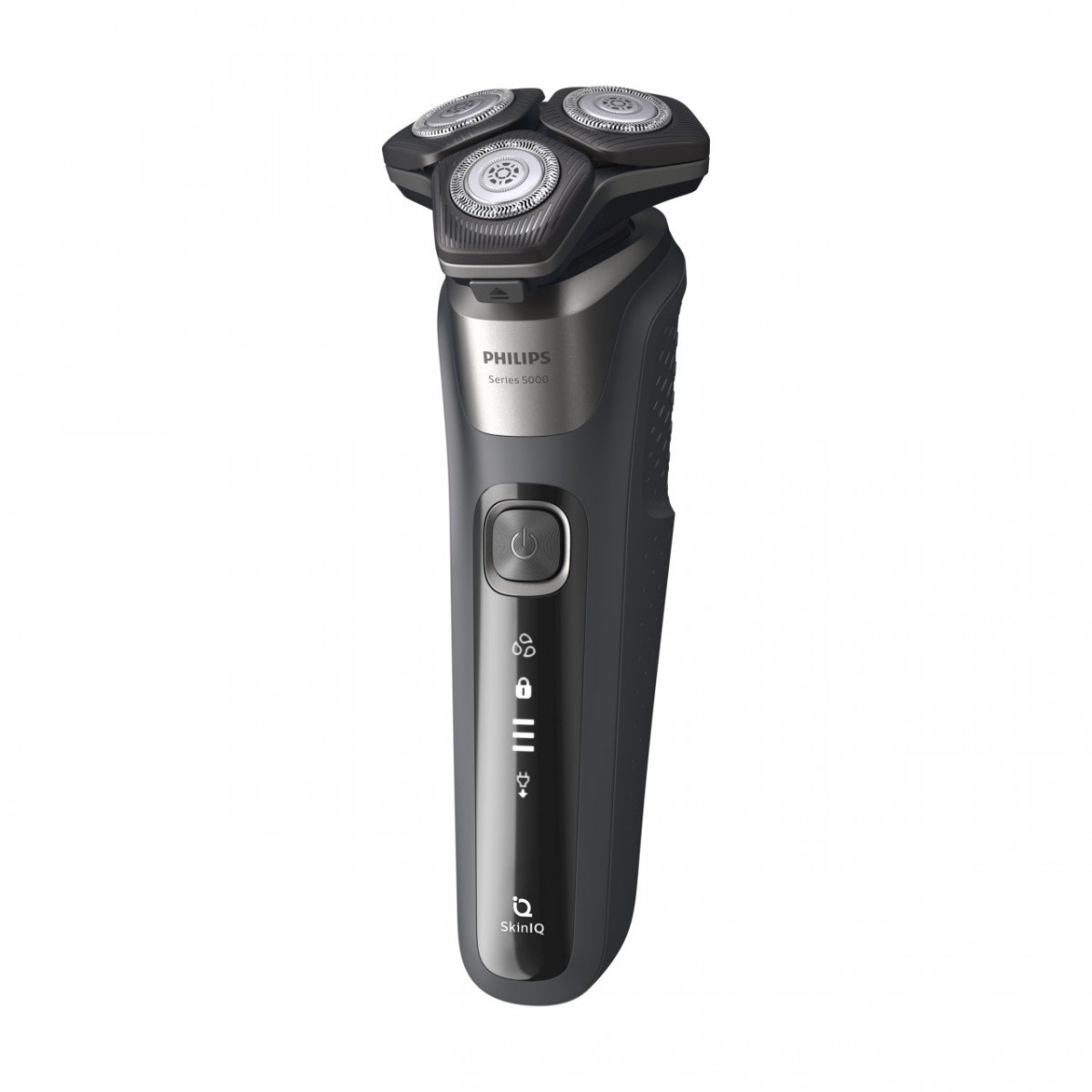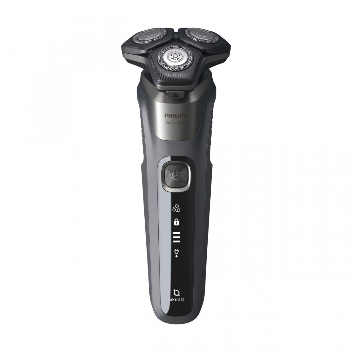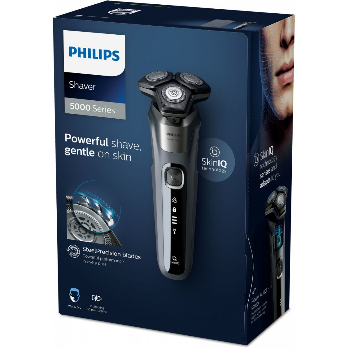 Philips SHAVER Series 5000 Rasoio elettrico Wet & Dry con lame SteelPrecision. Sistema di rasatura: Rotazione, Tecnologia del sistema di rasatura: SteelPrecision, SkinIQ. Colore del prodotto: Grigio. Alimentazione: Batteria, Tecnologia batteria: Ioni di Litio, Tipo batteria: Batteria integrata. Tipo di imballo: Scatola