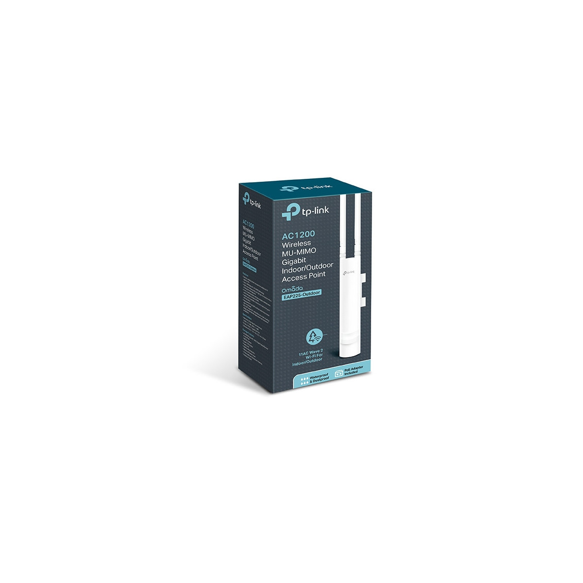 TP-LINK EAP225-Outdoor. Velocità massima di trasferimento dati: 1200 Mbit/s, Velocità massima di trasferimento dati (2,4 GHz): 300 Mbit/s, Velocità massima di trasferimento dati (5 GHz): 867 Mbit/s. Algoritmi di sicurezza supportati: 802.1x RADIUS. Voltaggio di uscita: 24 V, Consumi: 10,5 W. Installazione: Soffitto, Parete, Colore del prodotto: Bianco, Certificazione: CE、FCC、RoHS. Tipo di antenna: Esterno, Tipo di direzione dell'antenna: Omnidirezionale, Caratteristiche dell'antenna: Antenna staccabile