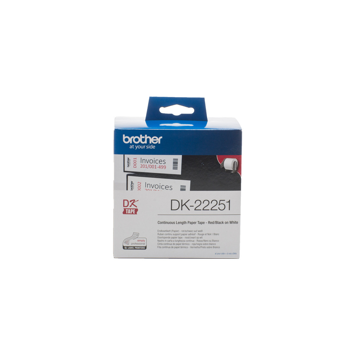 Brother DK-22251. Colore etichetta: Nero e rosso su bianco, Tipo nastro: DK, Colore del prodotto: Nero, Blu, Bianco. Ampiezza nastro: 6,2 cm, Lunghezza nastro: 15,24 m, Quantità per pacco: 1 pezzo(i)